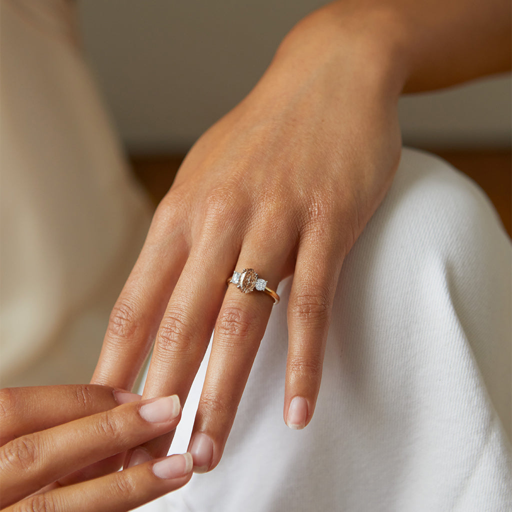 These stones may fall lower on the colour grading scale but they create rich, captivating shades that feel romantic, organic and deeply personal. Rather than chasing icy perfection, couples are embracing stones that feel unique and special to them. These warmer tones pair beautifully with yellow gold and antique settings, reinforcing the shift away from stark whiteness towards softness and depth.