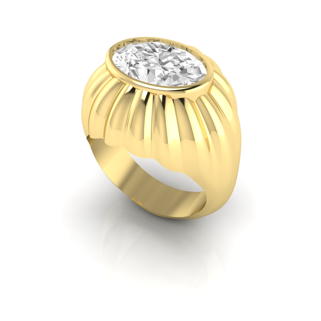 A vintage-inspired chunky 18K gold dome ring with a 3ct lab-grown Solar Diamond and beautiful gathering detail forms this stunning modern bespoke piece.
