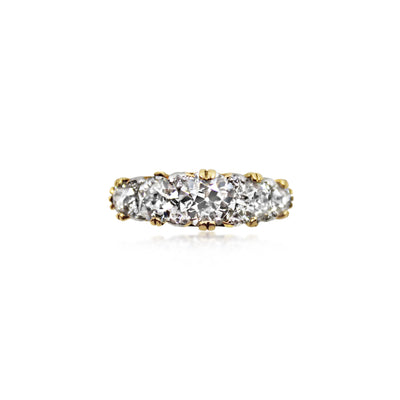 Antique graduated diamond five-stone carved half-hoop ring, set with a series of old mine-cut diamonds with rose-cut diamond points between, mounted in gold, total diamond weight approx. 3.00cts, size Q