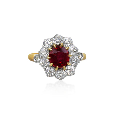 Antique ruby and diamond cluster ring, the central ruby weighing 1.40ct, within a ten-stone old mine-cut diamond surround, with diamond shoulders, mounted in platinum and 18ct gold, French, with AGL certificate nr. 1126488 dated 26th October 2022 stating the ruby is Thai origin, size O
