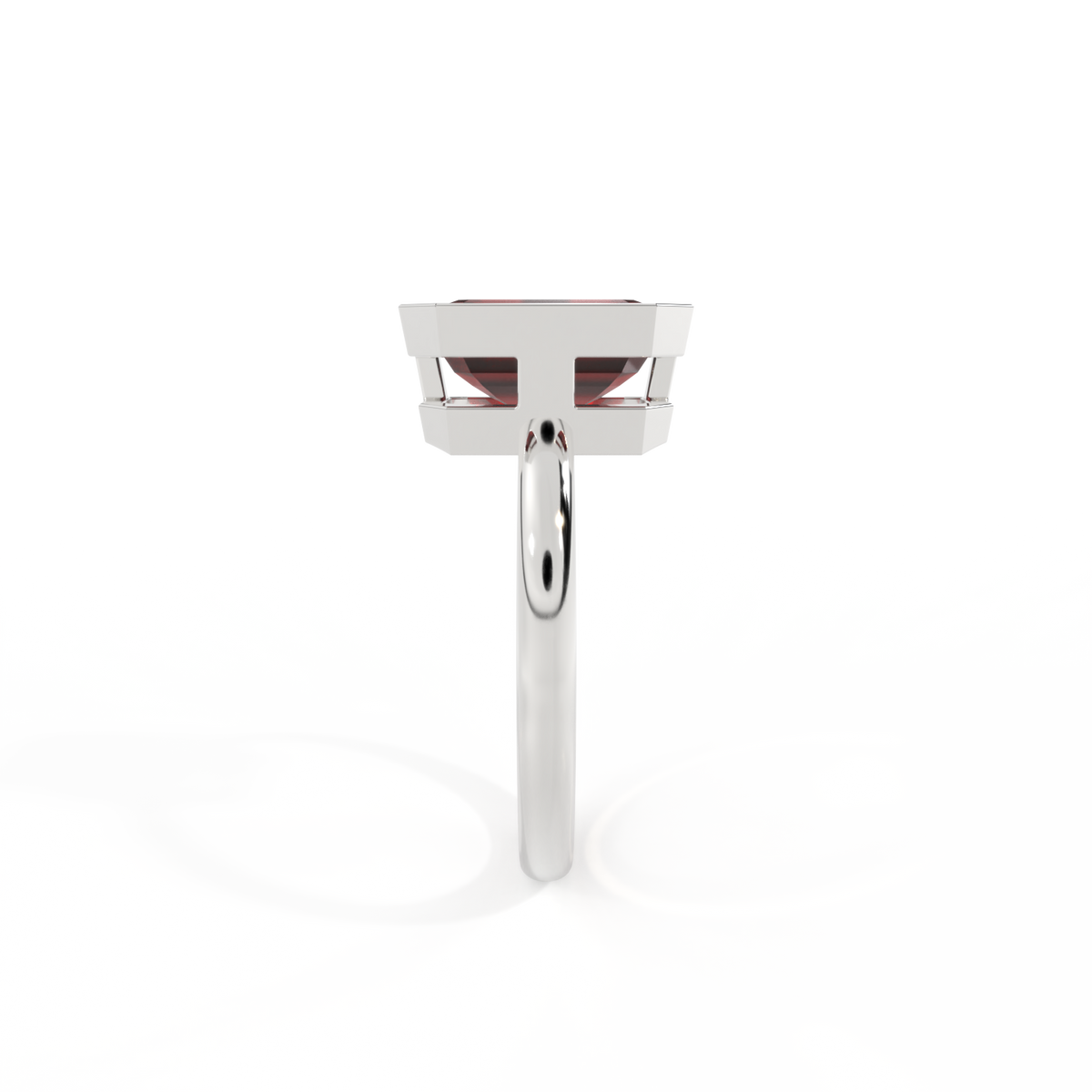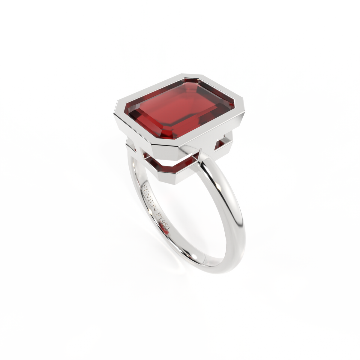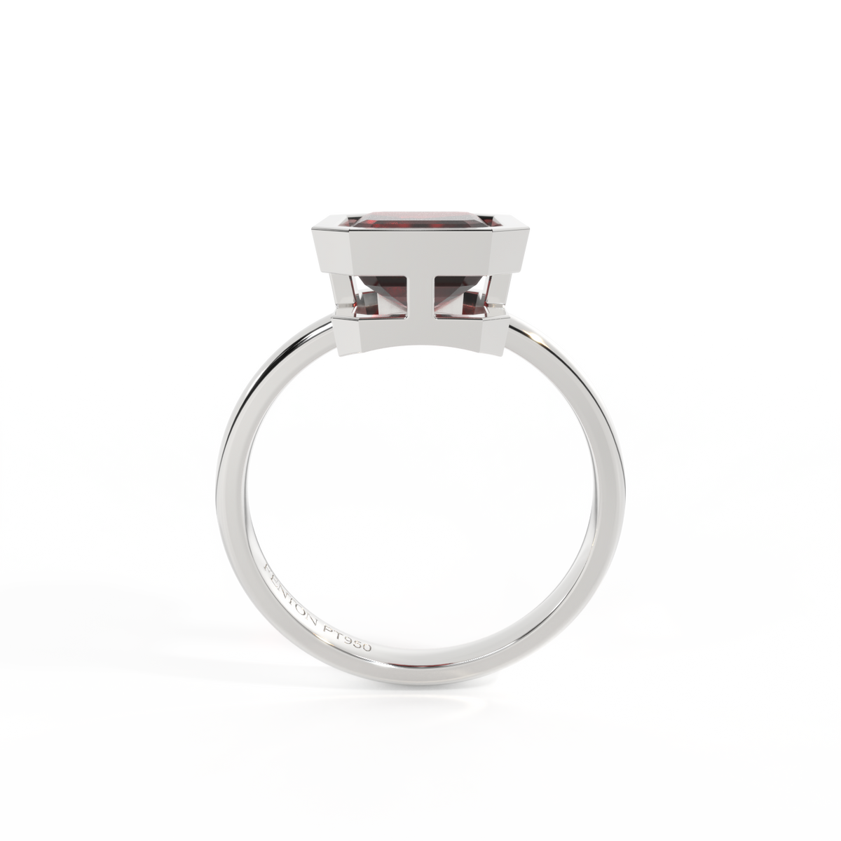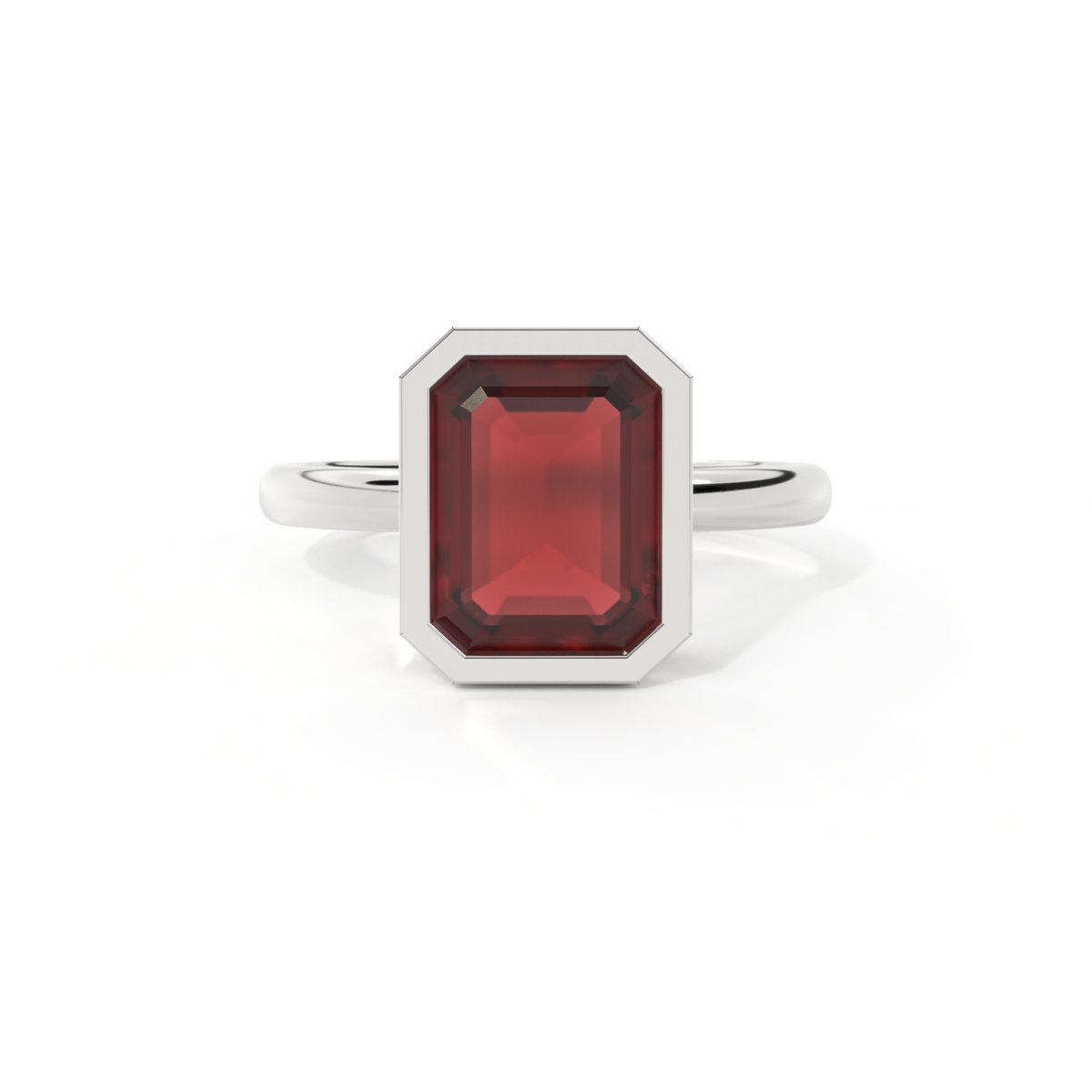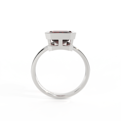 Minimalismus trifft auf Modernität - die einzigartigen Eigenschaften dieses Smaragd Schliffs Granat werden in The Bezel in den Mittelpunkt gerückt. Diese moderne Variante eines Solitaire rahmt den 6 mm großen Granat in einer sicheren, maßgefertigten Fassung ein, die schlicht und auffällig zugleich ist.