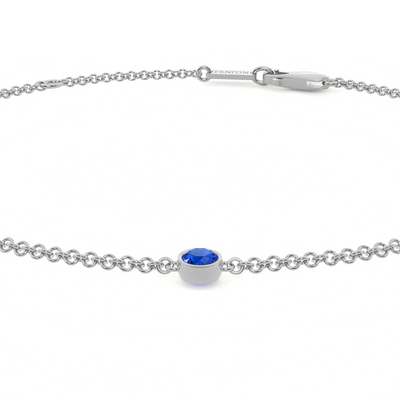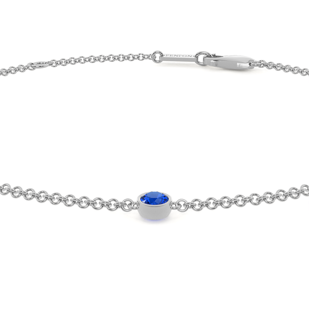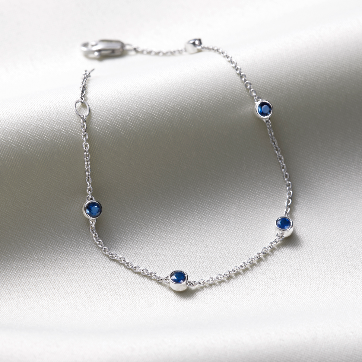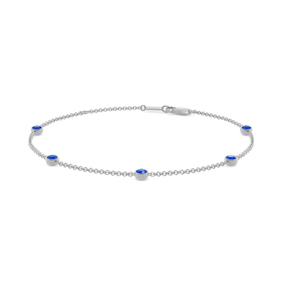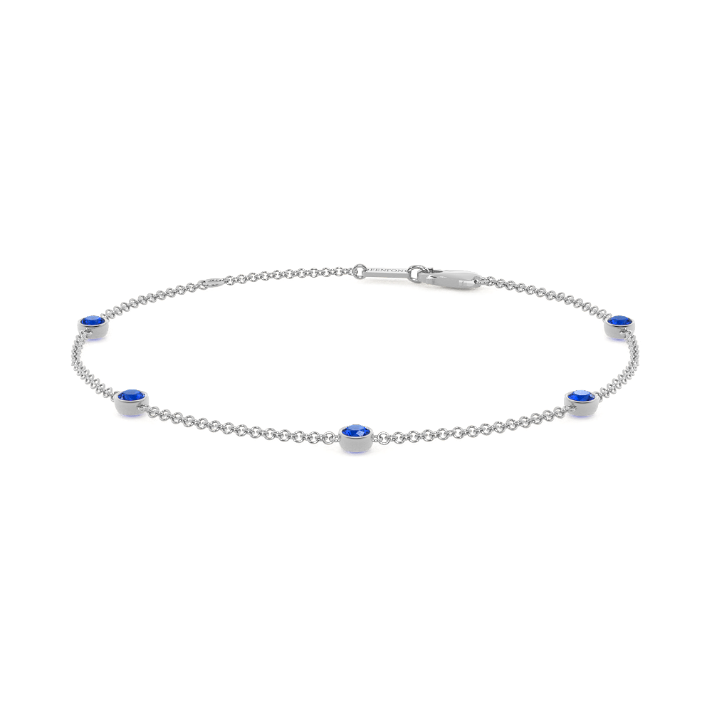 Unser Five Stone Bezel Blauer Saphir Armband bringt die Schönheit der minimalistischen Eleganz zum Vorschein. Die klassische Kette 18 Karat Weißgold trägt fünf glitzernde, 3 mm große Steine im Rundschliff Blauer Saphir, die jeweils in einer modernen Bezel-Fassung befestigt sind und ein perfektes, alltagstaugliches Armband und ein müheloses, funkelndes Statement an Ihrem Handgelenk bilden.