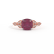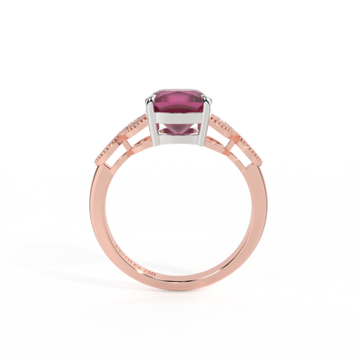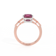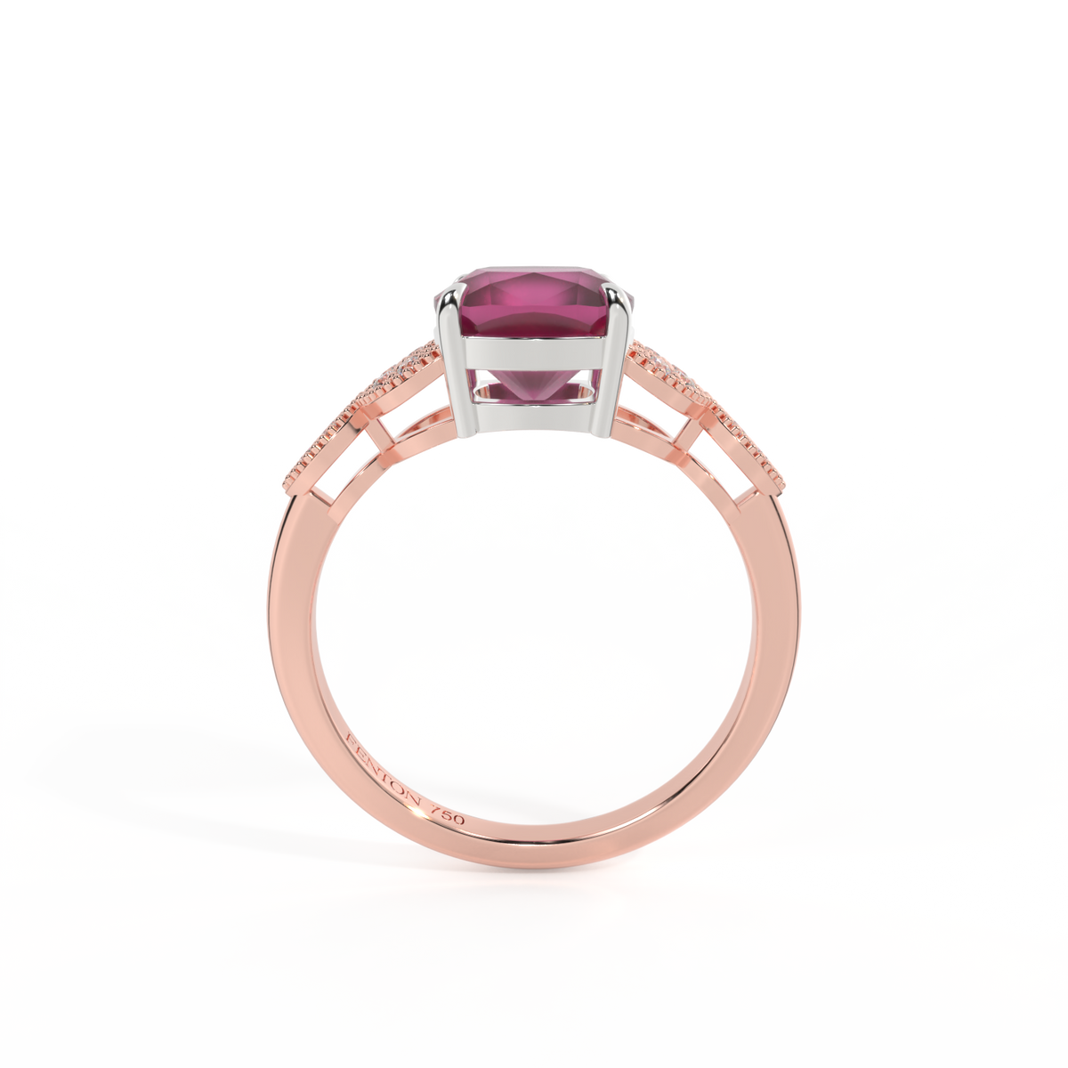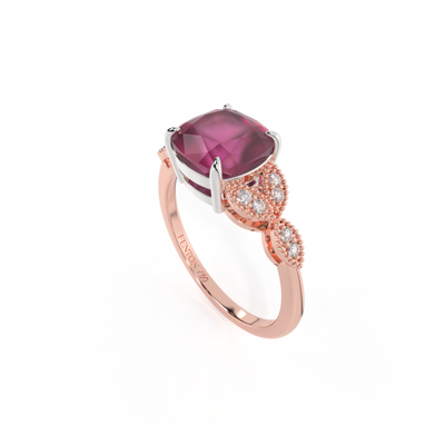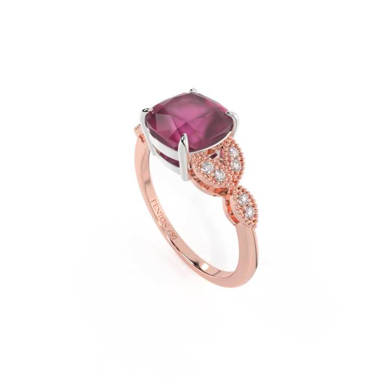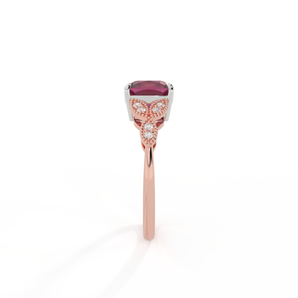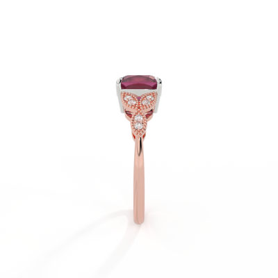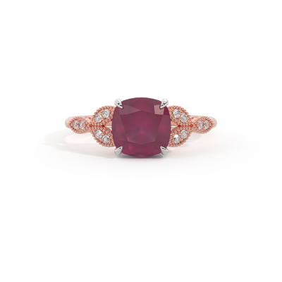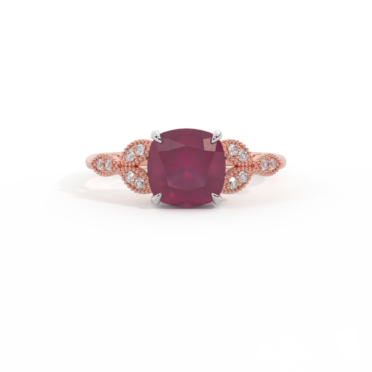 Die Schönheit einer Blume, neu interpretiert für die Ewigkeit. Inspiriert von der Romantik der viktorianischen Ära, wird dieser Kissen Schliff Rubin von einem Duo zarter diamantbesetzter Blütenblätter mit Millegrain-Details akzentuiert - eine elegante Variante eines zeitlosen Klassikers.