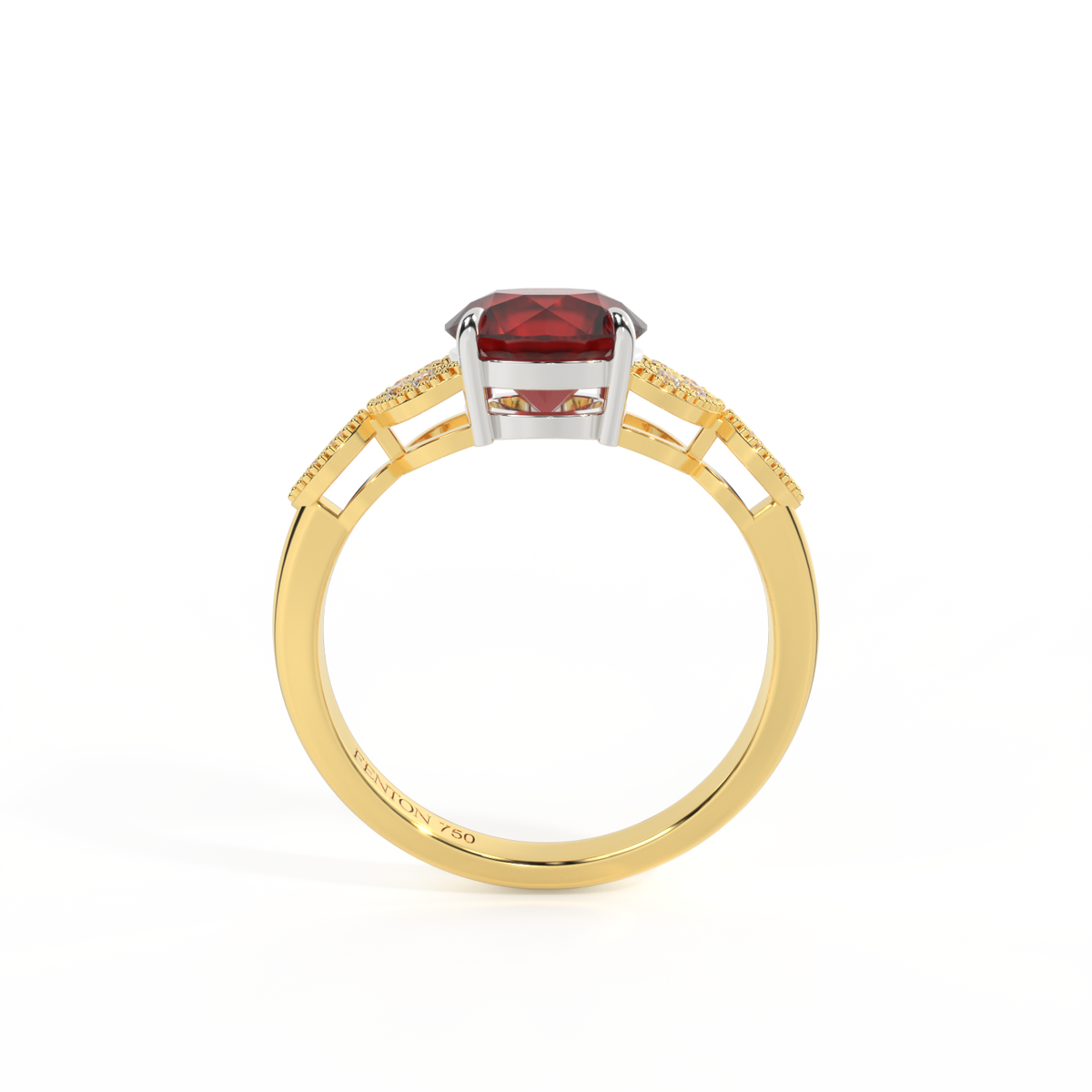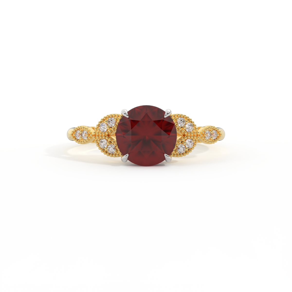 Die Schönheit einer Blume, neu interpretiert für die Ewigkeit. Inspiriert von der Romantik der viktorianischen Ära, wird dieser Runden Schliff Granat von einem Duo zarter diamantbesetzter Blütenblätter mit Millegrain-Details akzentuiert - eine elegante Variante eines zeitlosen Klassikers.