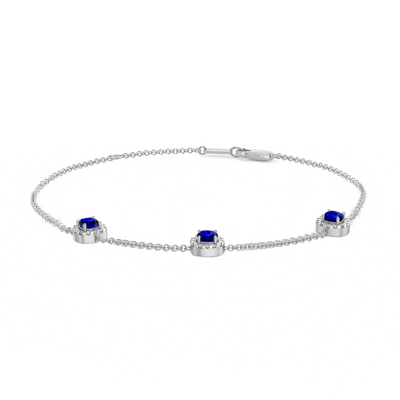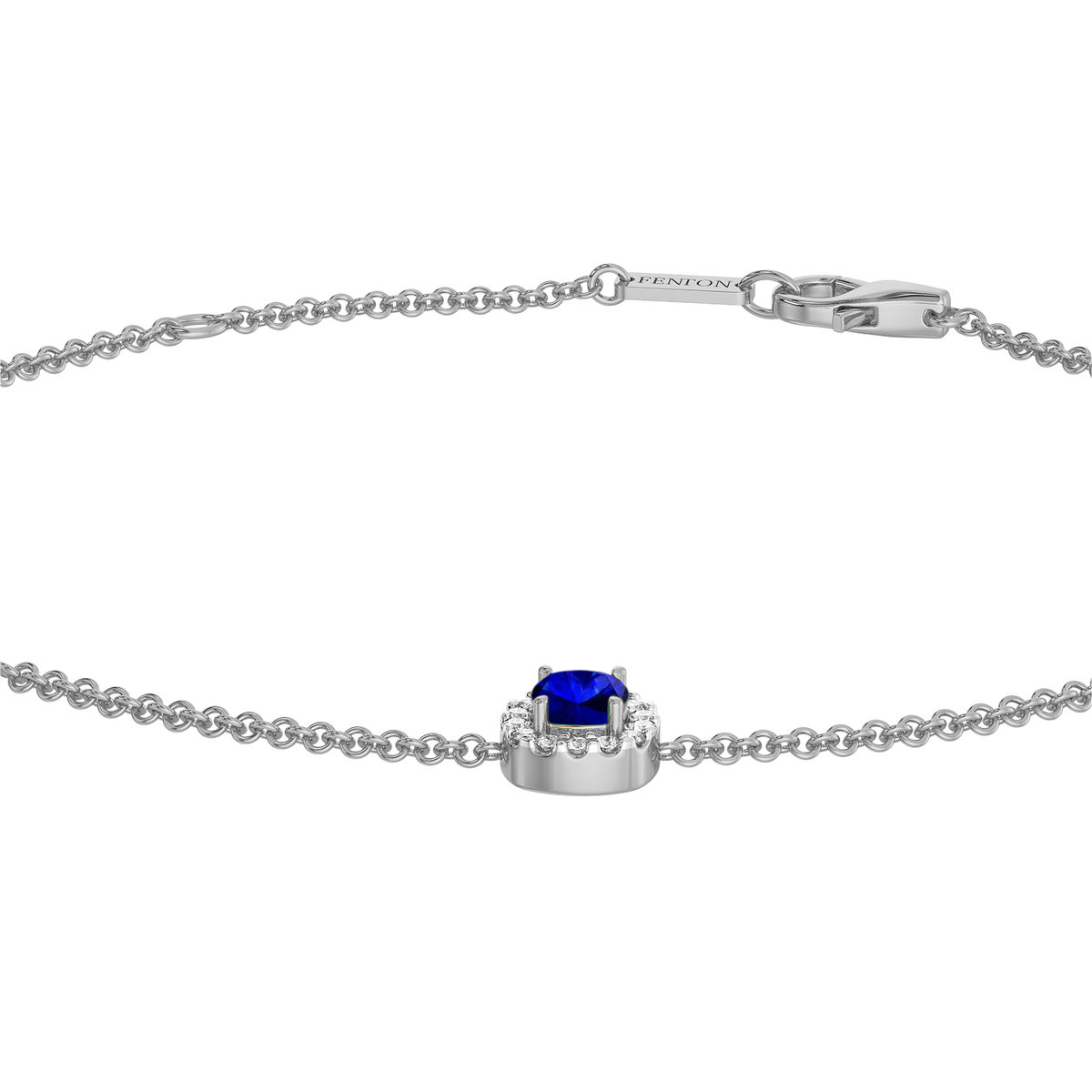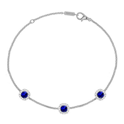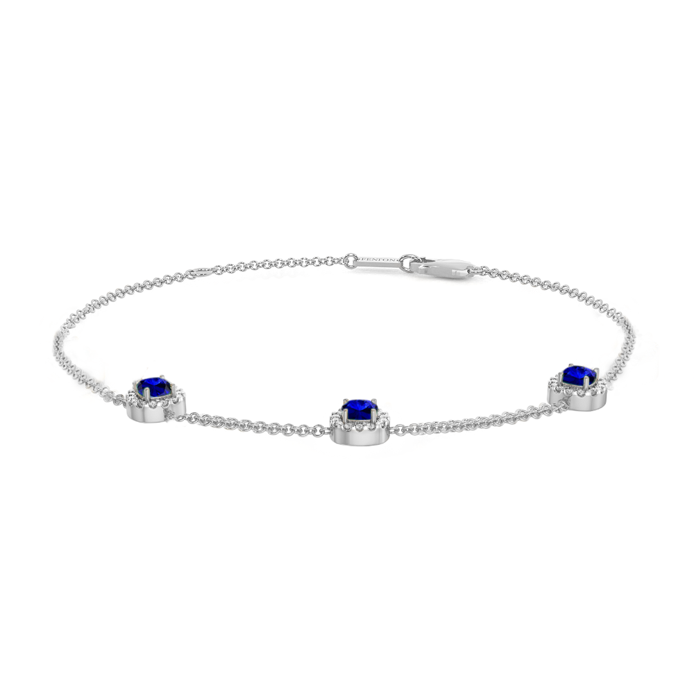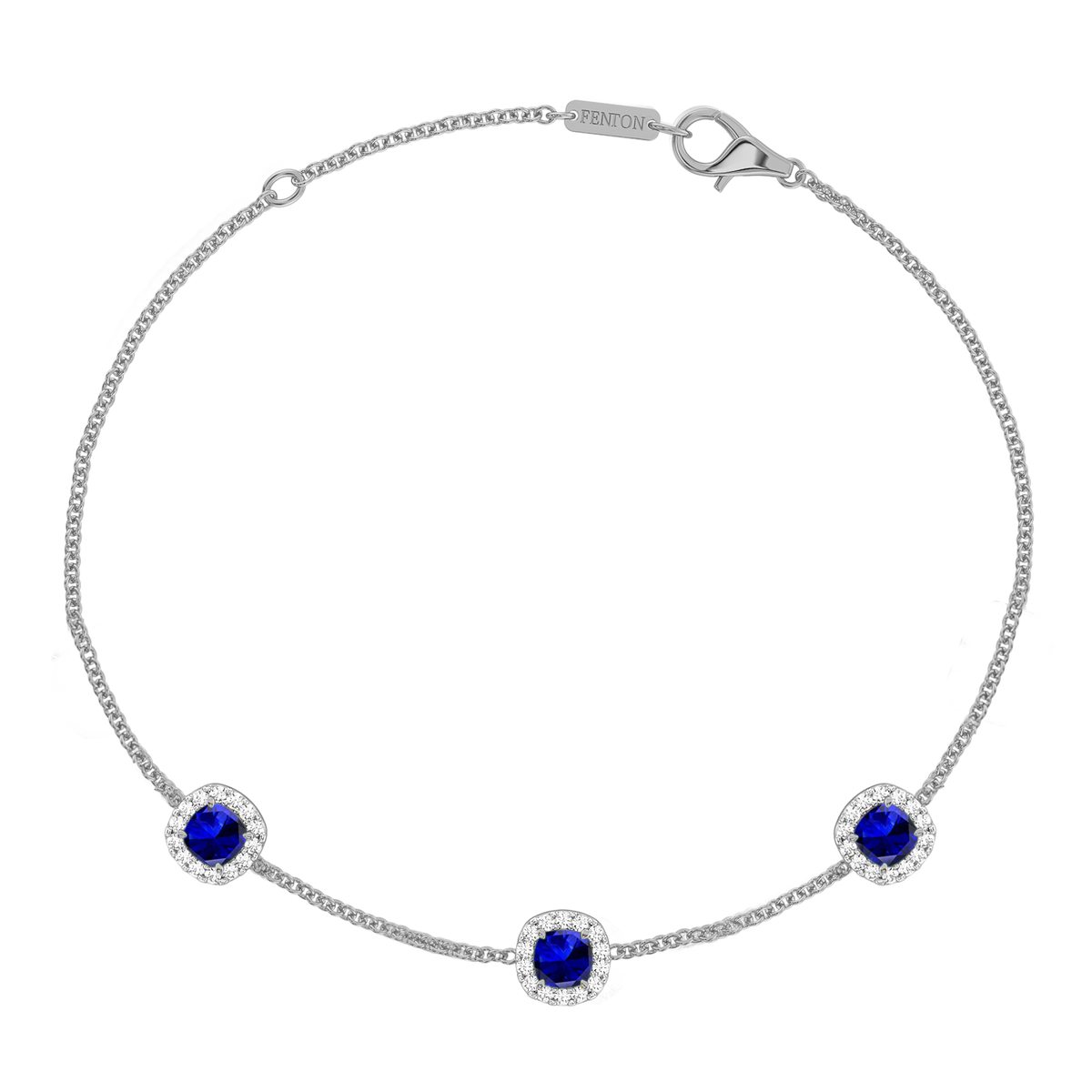 Das Garland Armband in Blauer Saphir vereint feminine Romantik und zeitlosen Stil. Dieses zarte Design mit drei Kissen Blauer Saphir Steinen in einer klassischen Krallenfassung, umgeben von einem glitzernden Halo aus Diamanten der Farbe G/H und der Reinheit VS, ist ein Schmuckstück, das man für immer in Ehren hält. Das Design mit drei Steinen ist ein Favorit von Fenton und erinnert an eine Blumengirlande, eines der universellsten Symbole der Liebe.