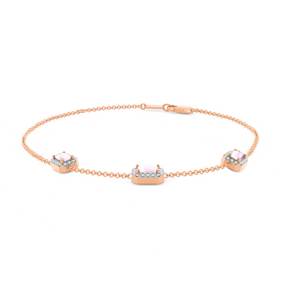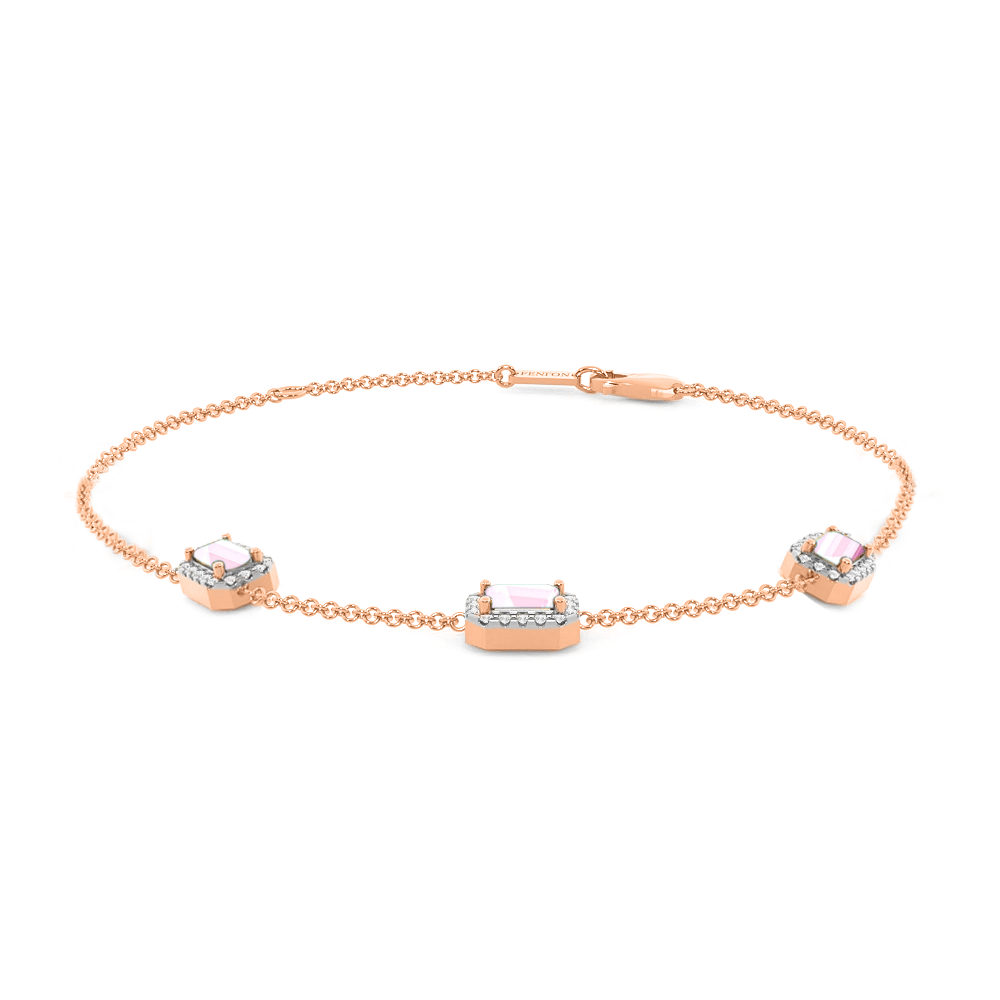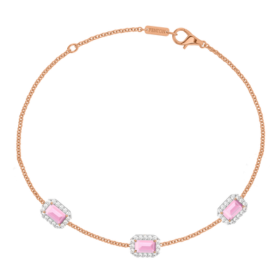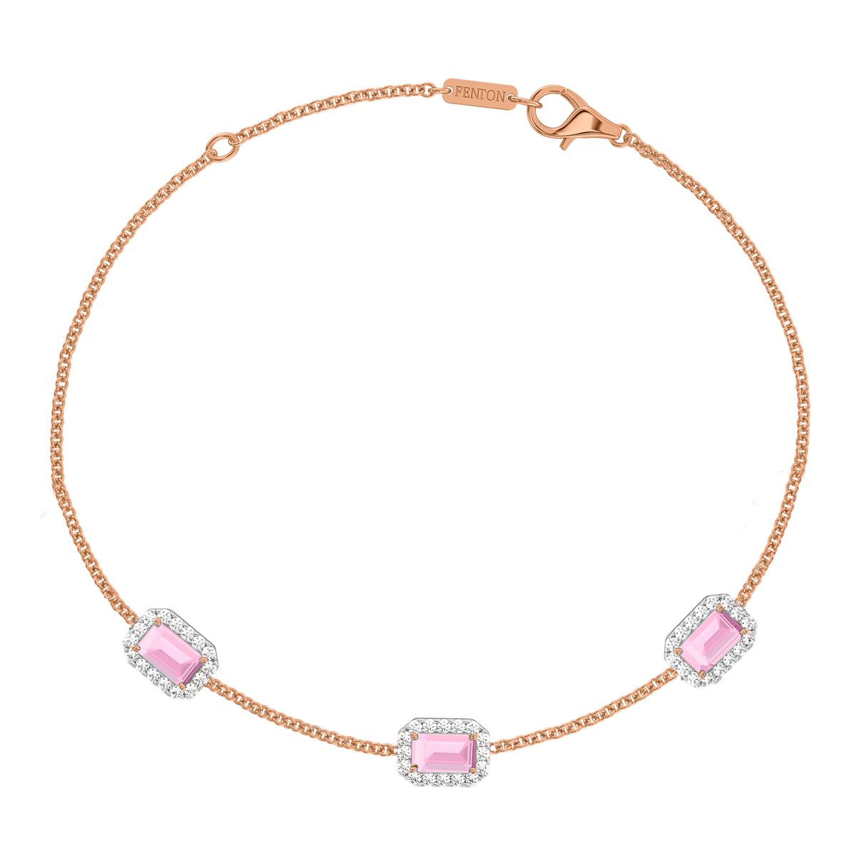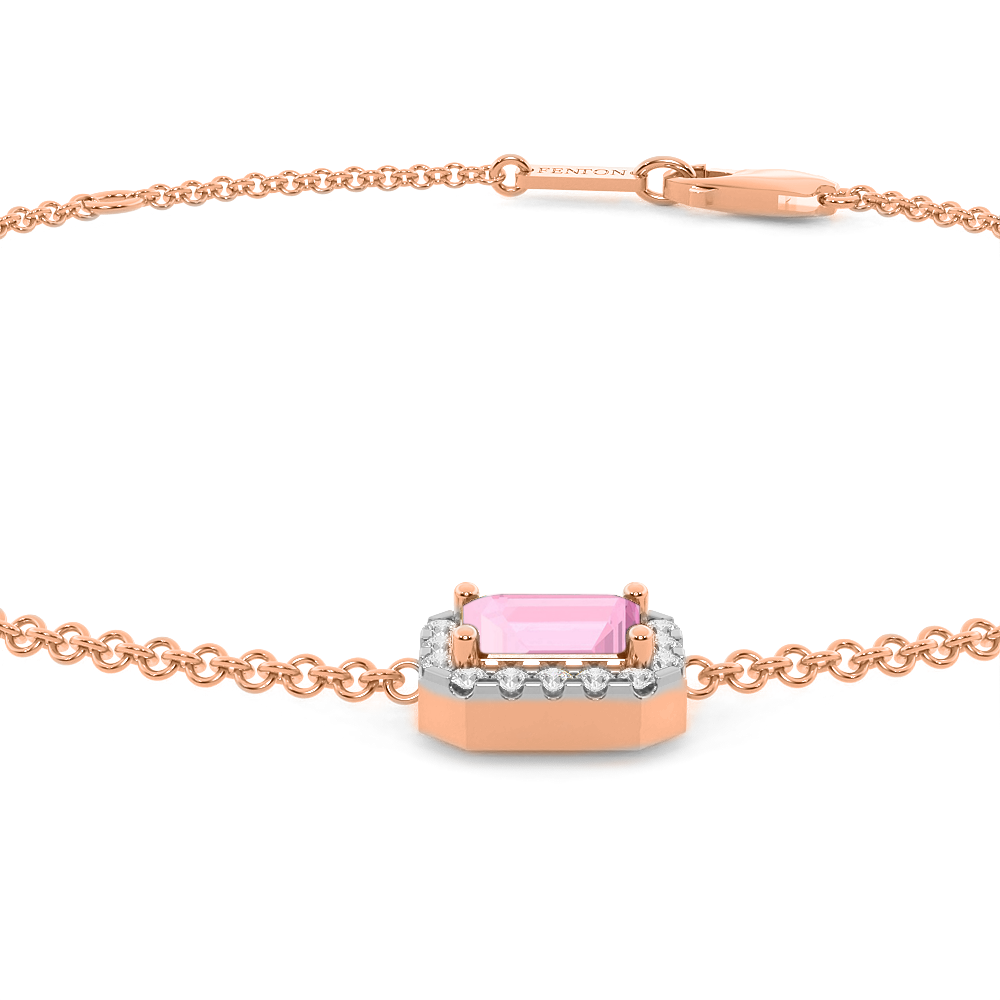 Das Garland Armband in Rosa Saphir vereint feminine Romantik und zeitlosen Stil. Dieses zarte Design mit drei Smaragd Rosa Saphir Steinen in einer klassischen Krallenfassung, umgeben von einem glitzernden Halo aus Diamanten der Farbe G/H und der Reinheit VS, ist ein Schmuckstück, das man für immer in Ehren hält. Das Design mit drei Steinen ist ein Favorit von Fenton und erinnert an eine Blumengirlande, eines der universellsten Symbole der Liebe.