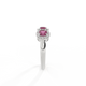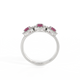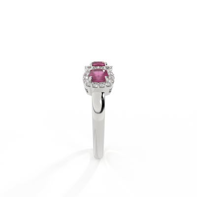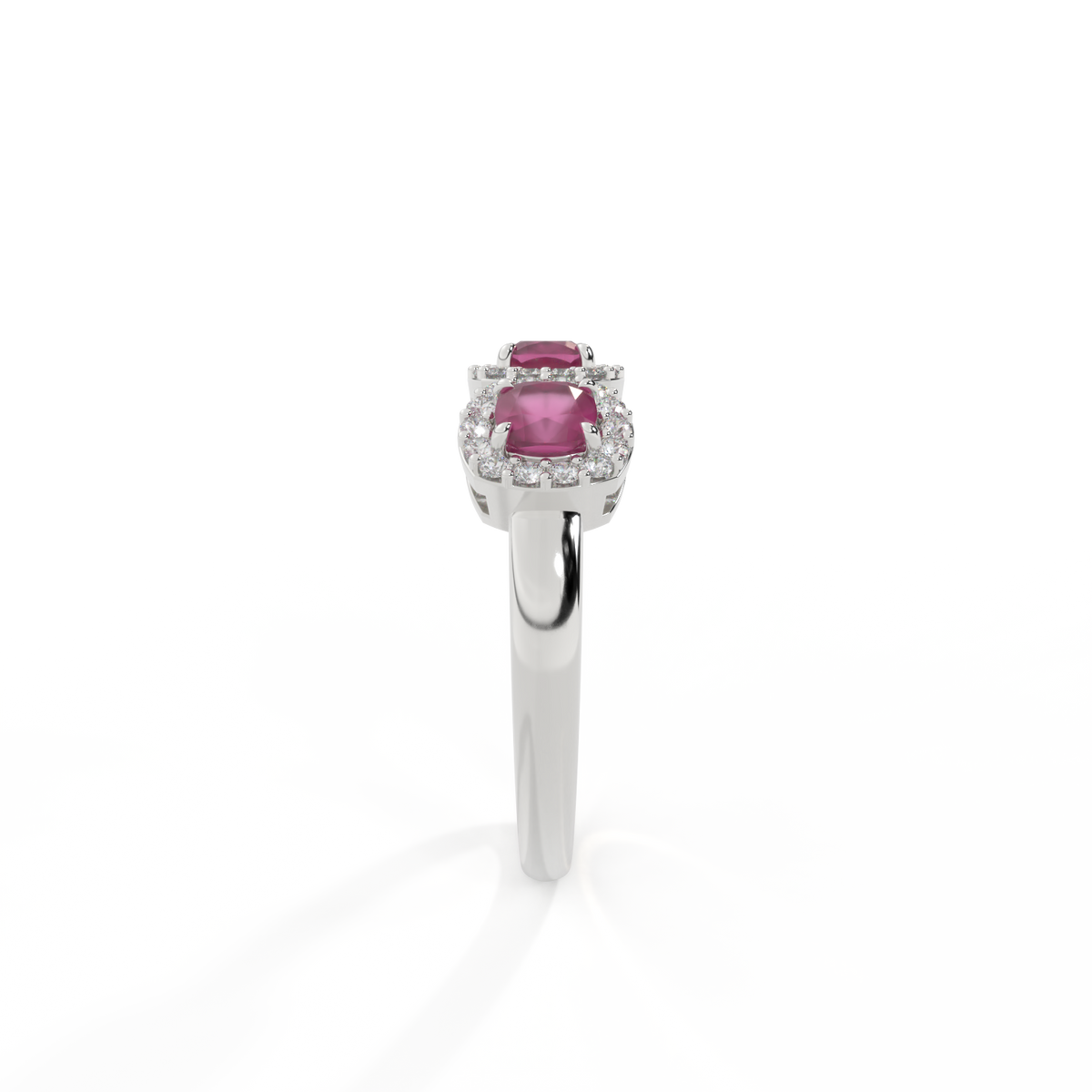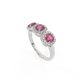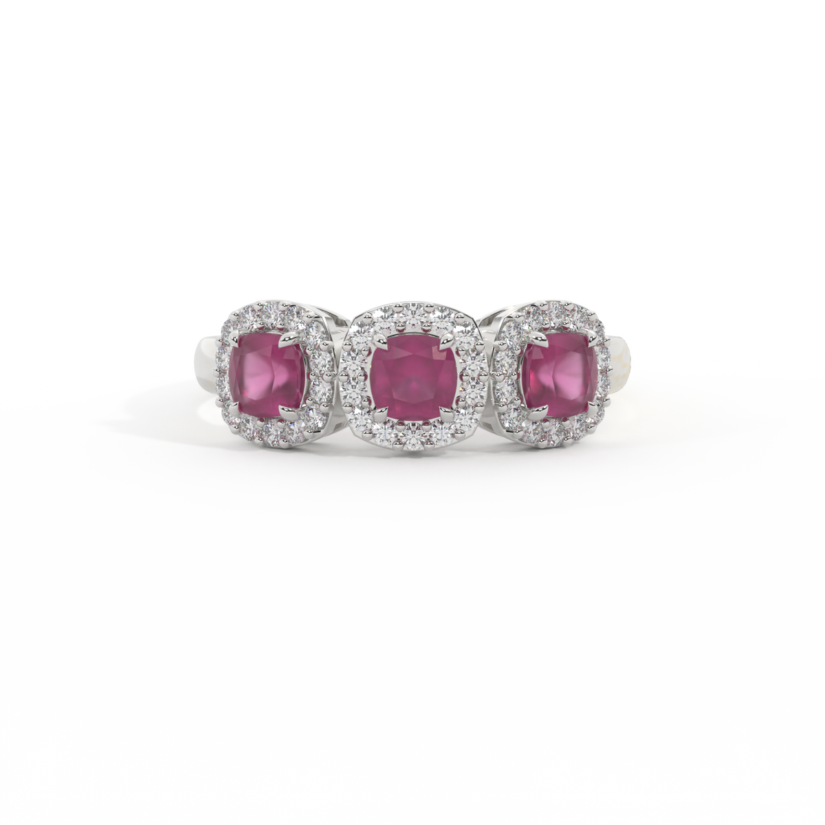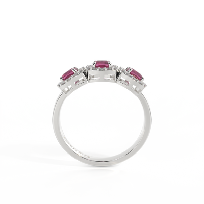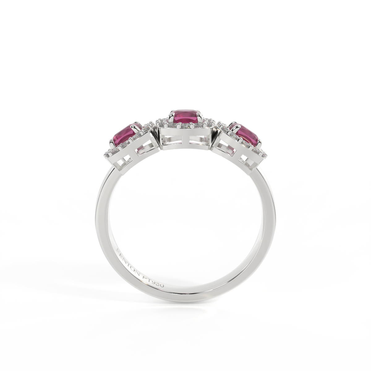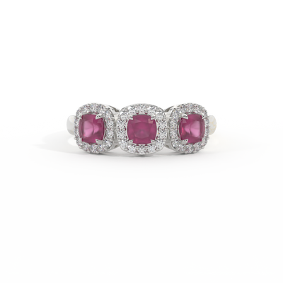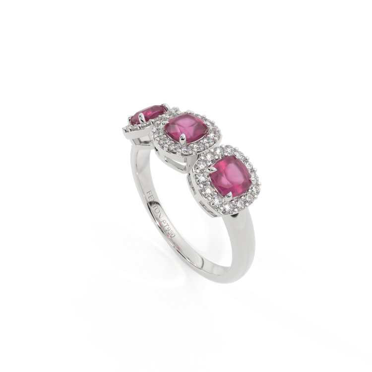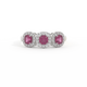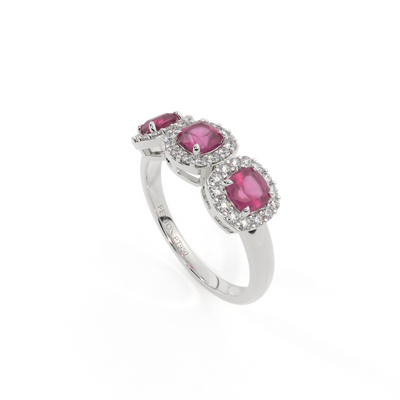 Diese niedrig gefasste, super tragbare Schönheit erinnert an eine florale Girlande, eines der universellsten Symbole der Liebe. Drei Kissen geschliffene Rubin Steine sind von diamantbesetzten Halos umgeben, jeder Stein ist ein absolutes Unikat.