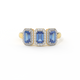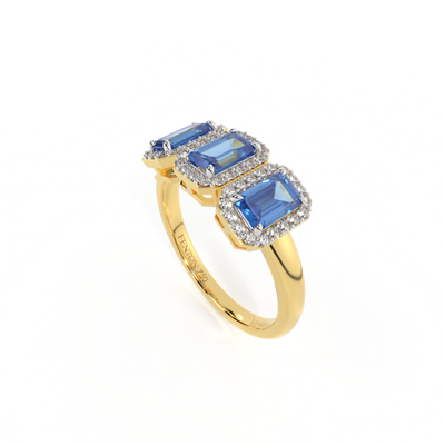 Diese niedrig gefasste, super tragbare Schönheit erinnert an eine florale Girlande, eines der universellsten Symbole der Liebe. Drei Smaragd geschliffene Blauer Saphir Steine sind von diamantbesetzten Halos umgeben, jeder Stein ist ein absolutes Unikat.