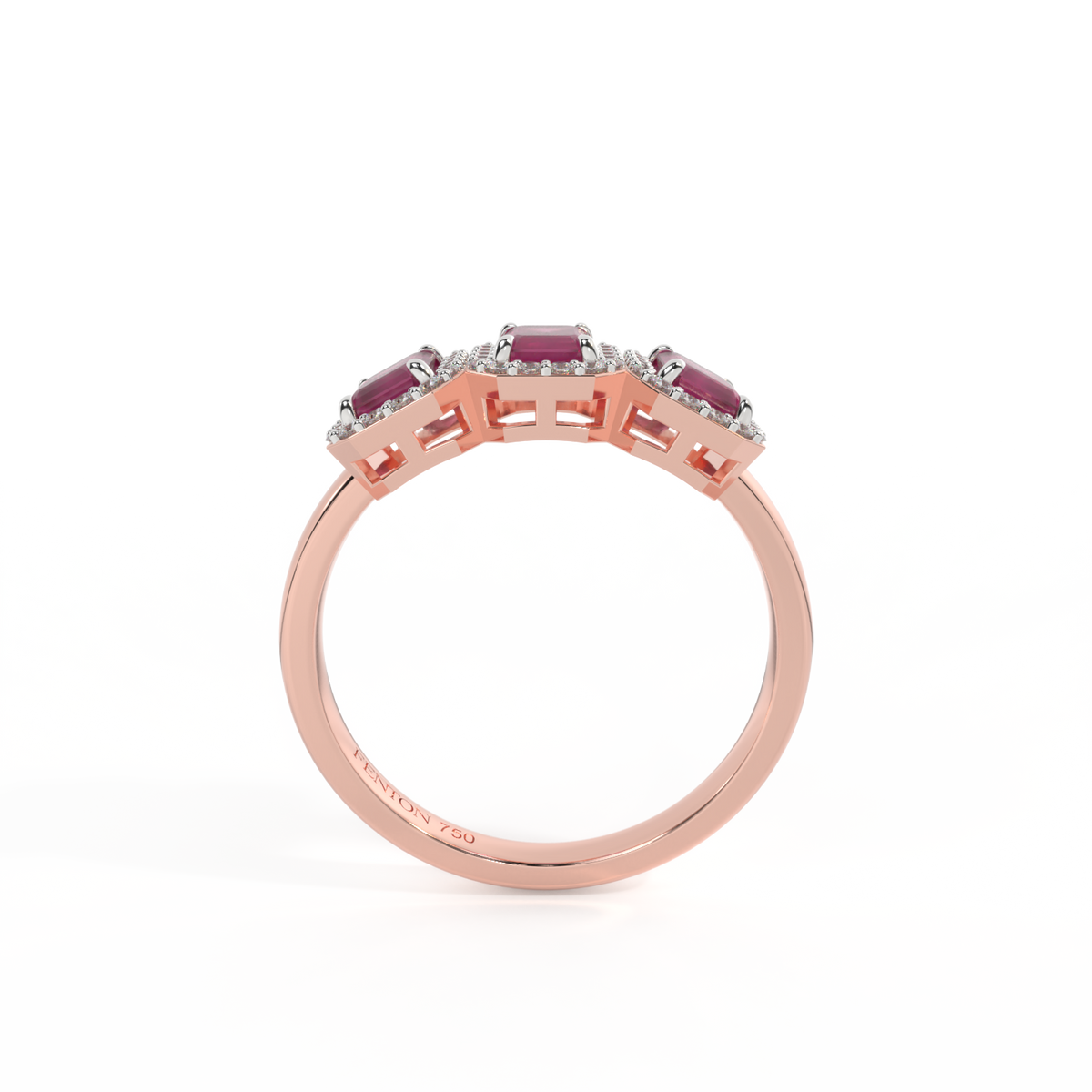 Diese niedrig gefasste, super tragbare Schönheit erinnert an eine florale Girlande, eines der universellsten Symbole der Liebe. Drei Smaragd geschliffene Rubin Steine sind von diamantbesetzten Halos umgeben, jeder Stein ist ein absolutes Unikat.