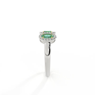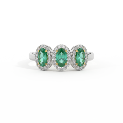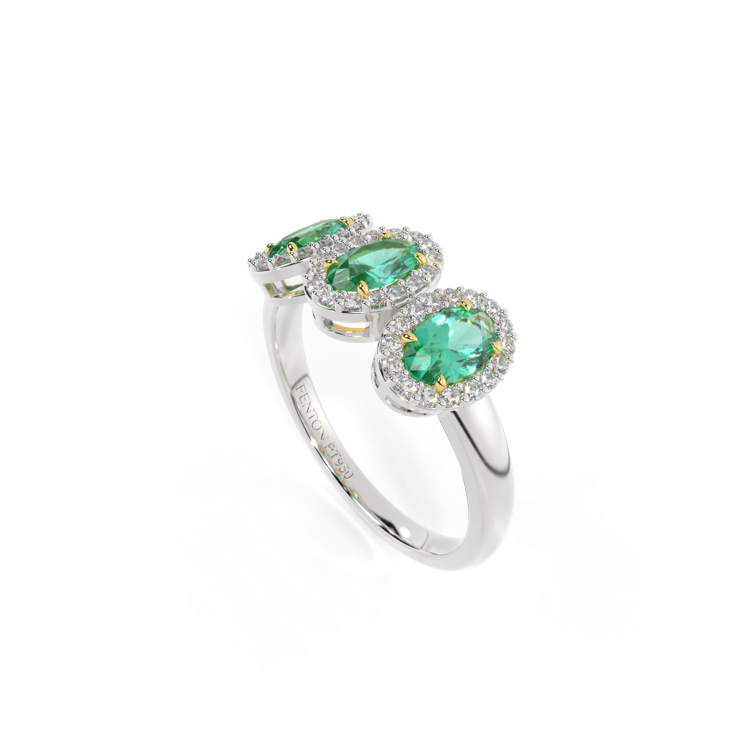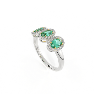 Diese niedrig gefasste, super tragbare Schönheit erinnert an eine florale Girlande, eines der universellsten Symbole der Liebe. Drei Oval geschliffene Smaragd Steine sind von diamantbesetzten Halos umgeben, jeder Stein ist ein absolutes Unikat.