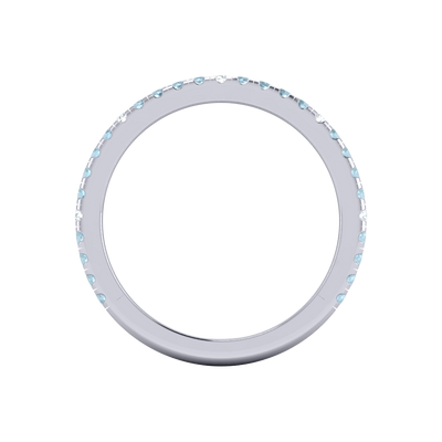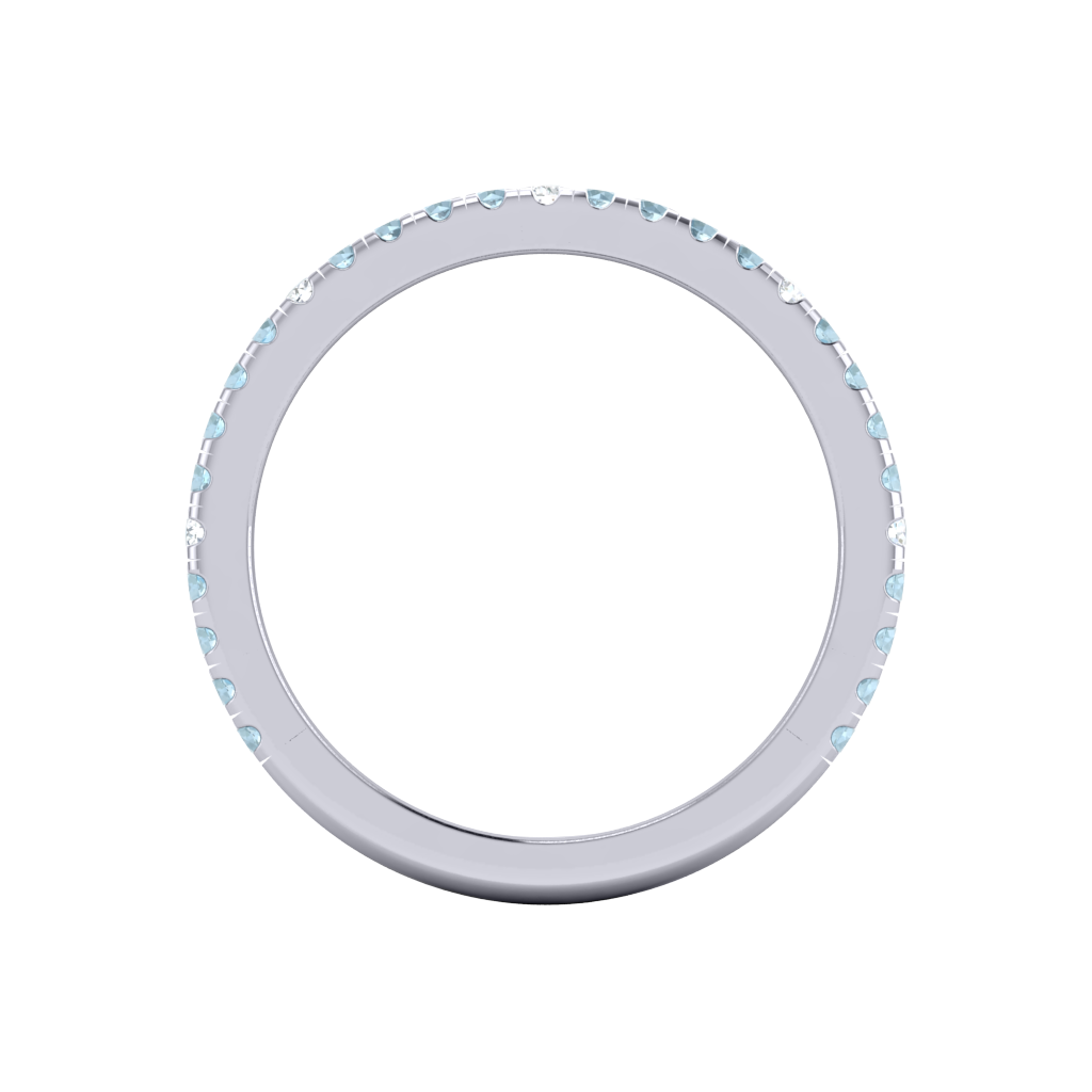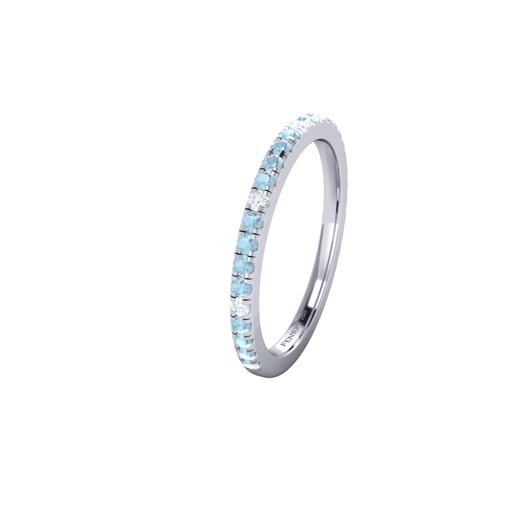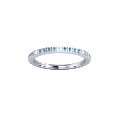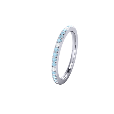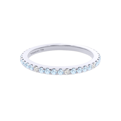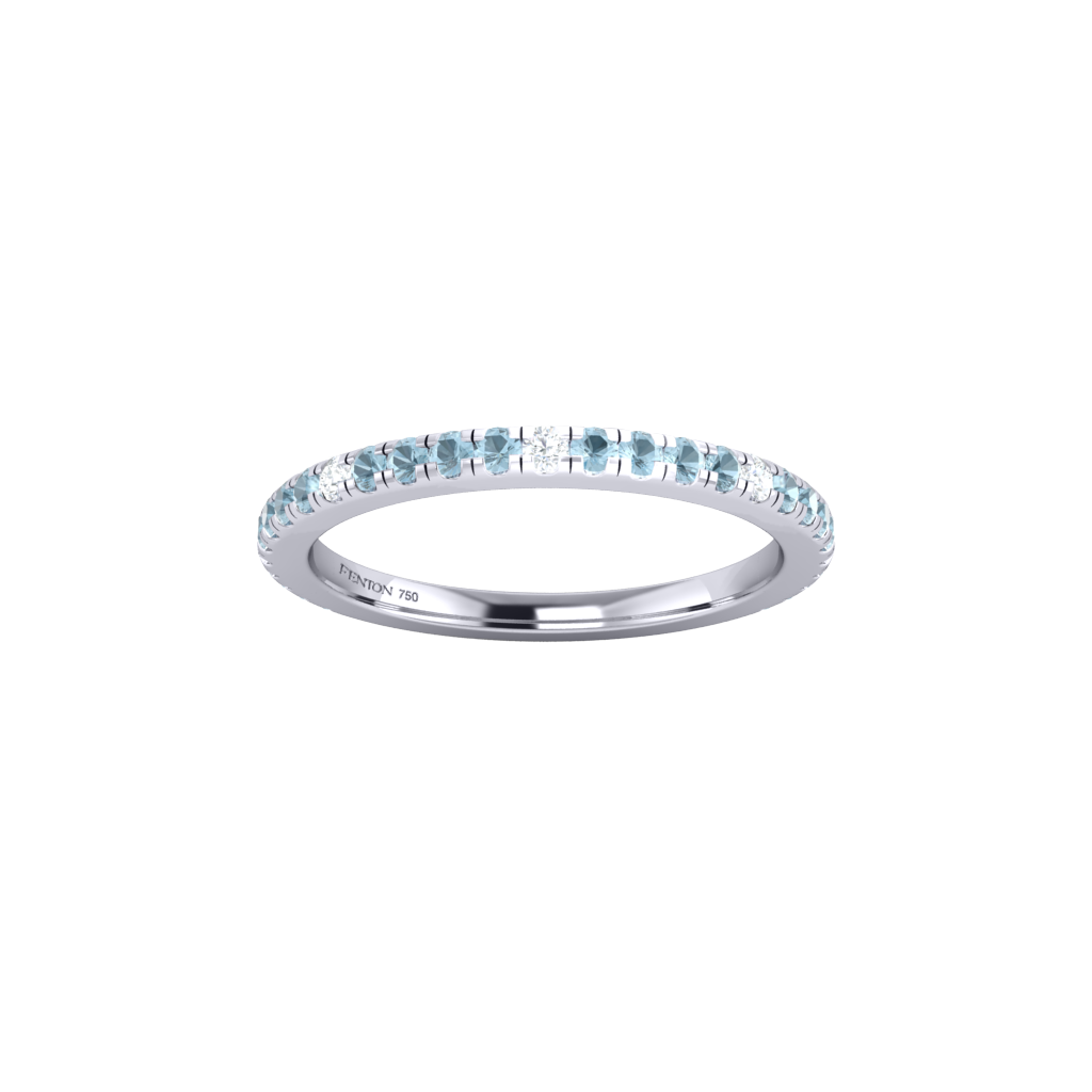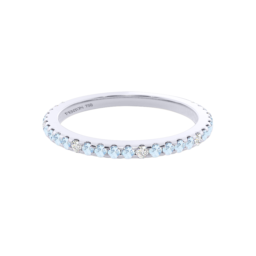 Mit dem Eternity-Band von Fenton verleihen wir einem Klassiker einen ganz neuen Dreh - raffiniert und zeitlos zugleich. Diese Ring lässt sich wunderbar solo tragen oder als klassischer Ehering zusammen mit Ihrem Verlobungsring für ultimatives Glitzern. Das Eternity Band trägt eine Reihe von funkelnden Aquamarin Edelsteinen und Diamantakzenten und ist aus wertvollen 18 Karat Weißgold gefertigt. Die Aquamarin und Diamanten Akzente verteilen sich über 3/4 Ihres glitzendern Ringes.