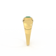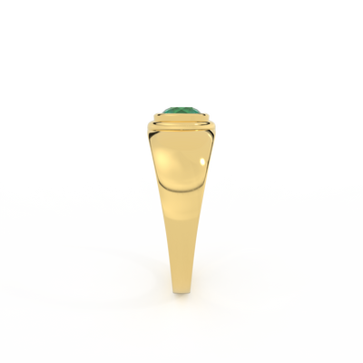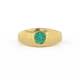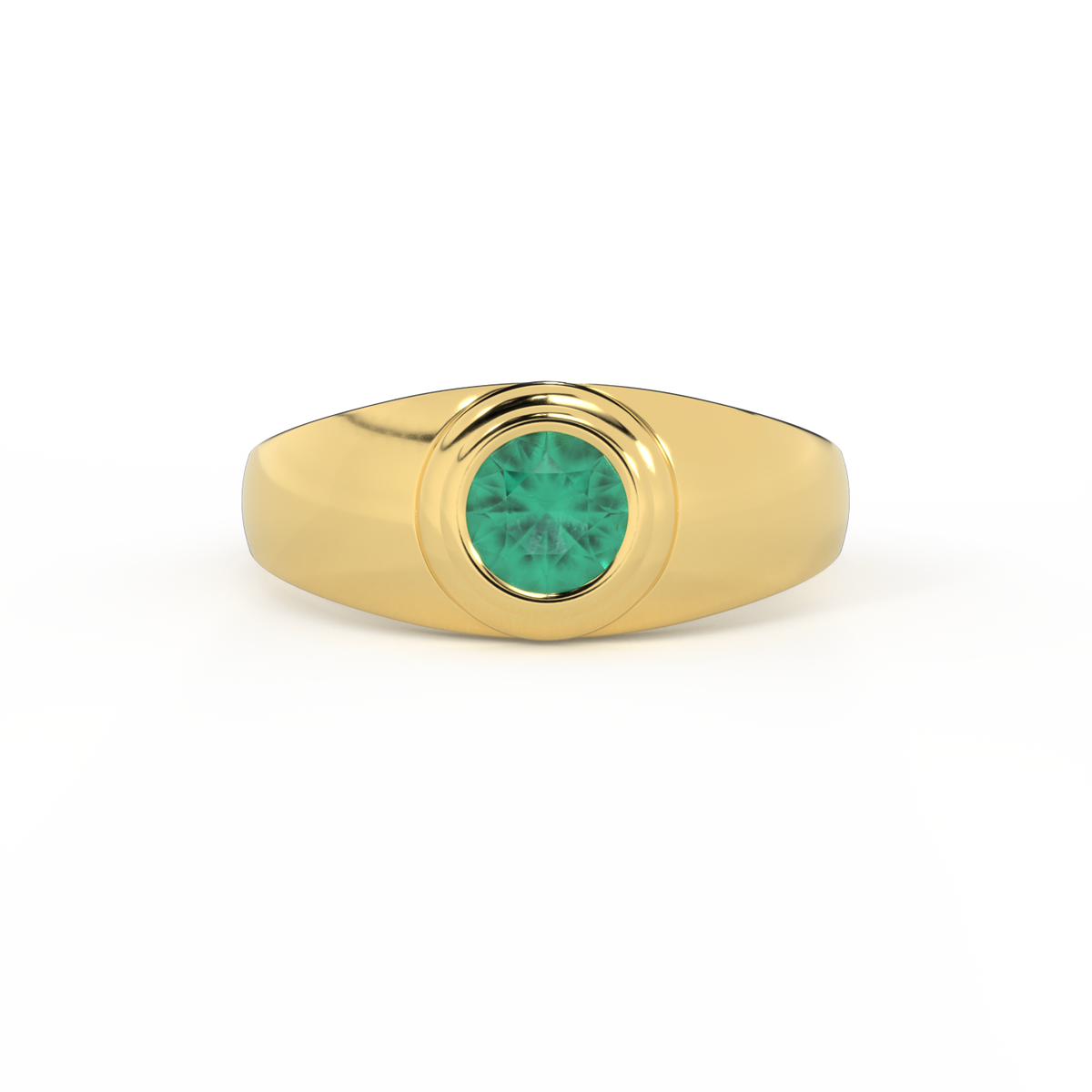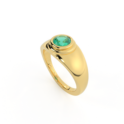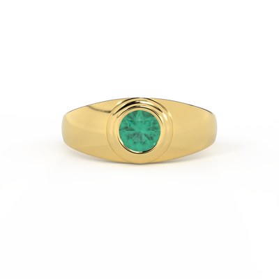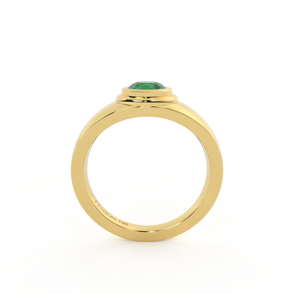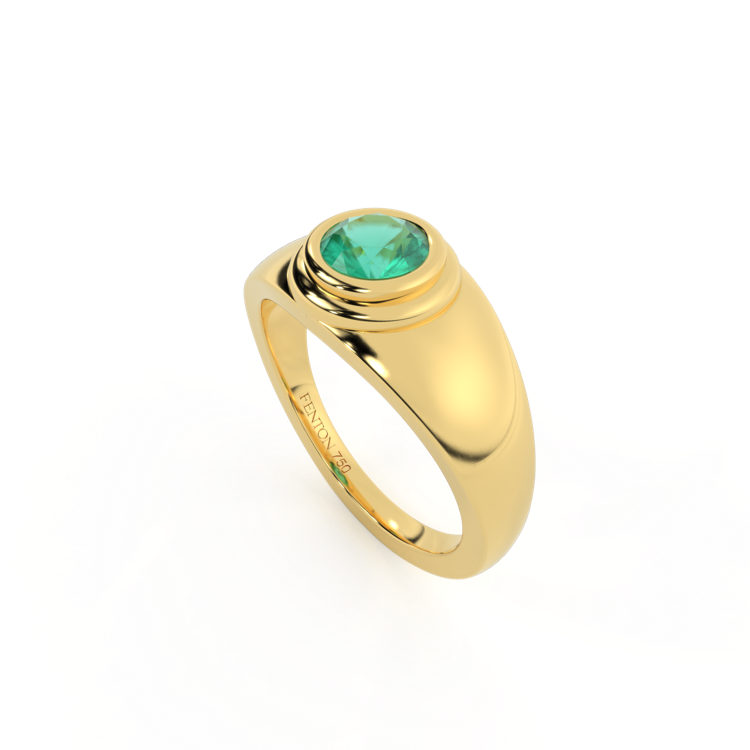 Dieses ikonische Schmuckstück ist mit einem Runden geschliffenen Smaragd besetzt, der in einer gestuften Lünettenfassung leicht über dem 18 Karat Gelbgold Band sitzt. Die Schultern verjüngen sich zur Mitte hin, und der abgerundete Schaft sorgt für maximalen Tragekomfort. Ein modernes Erbstück für jeden Tag.