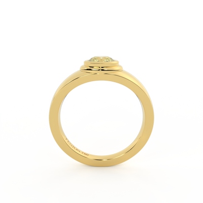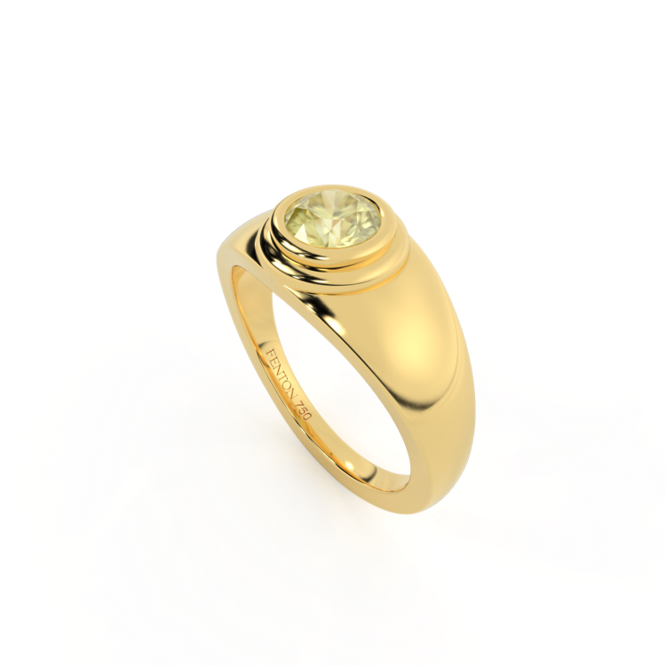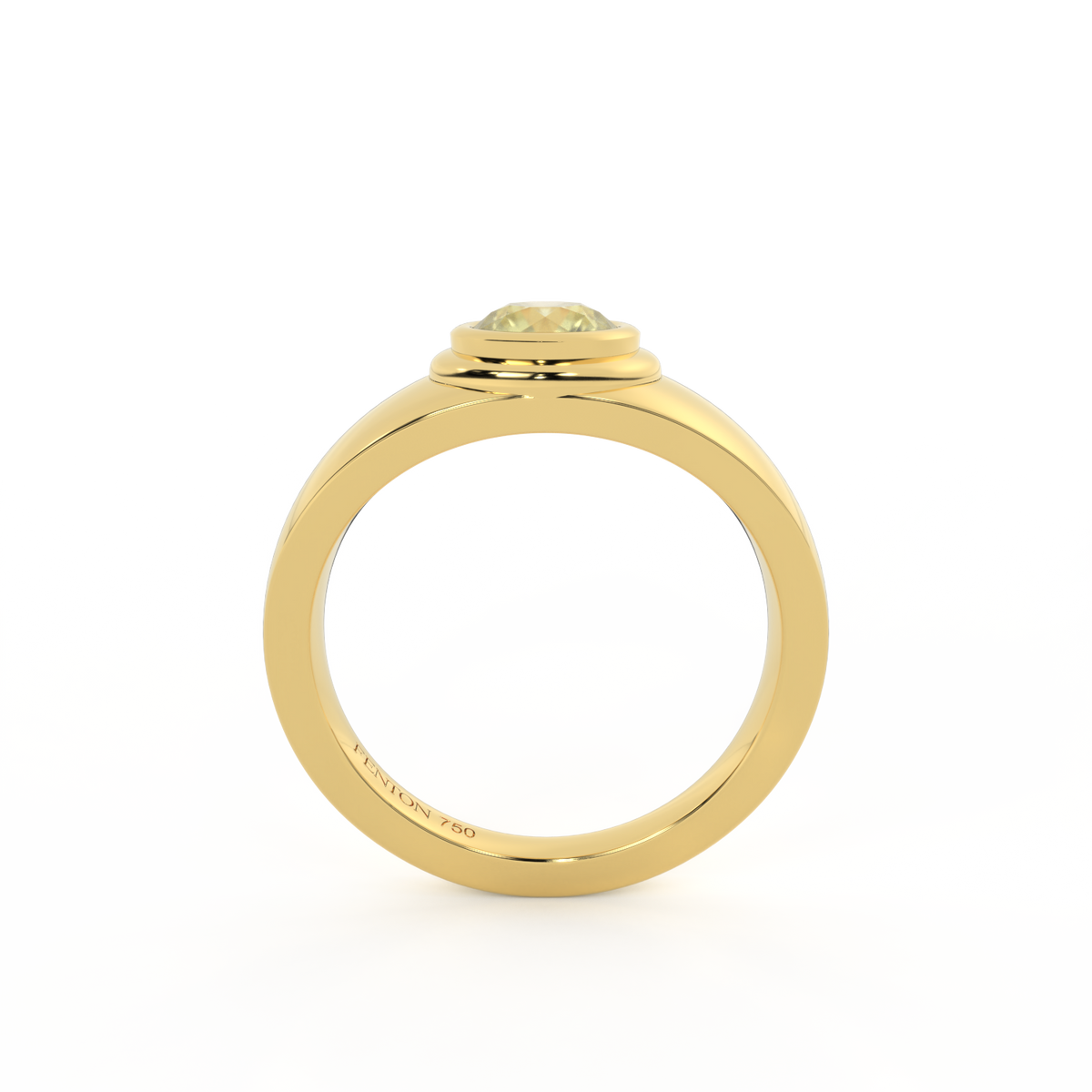 Dieses ikonische Schmuckstück ist mit einem Runden geschliffenen Gelber Saphir besetzt, der in einer gestuften Lünettenfassung leicht über dem 18 Karat Gelbgold Band sitzt. Die Schultern verjüngen sich zur Mitte hin, und der abgerundete Schaft sorgt für maximalen Tragekomfort. Ein modernes Erbstück für jeden Tag.