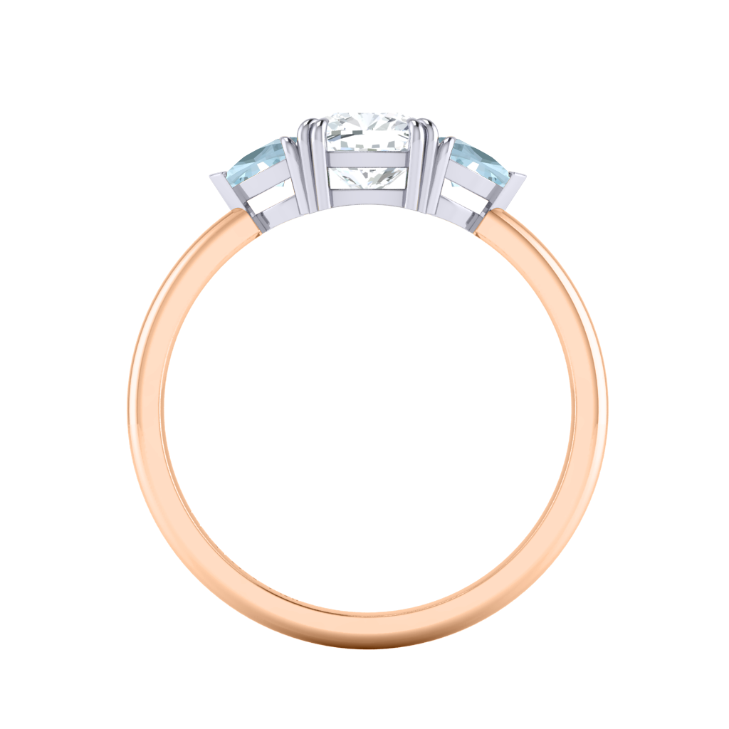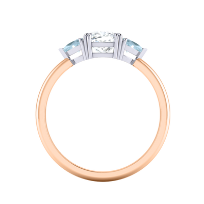 Lab Grown Solar Diamond Trilogy Cushion Cut Diamond and Aquamarine 18k Rose Gold Ring