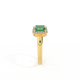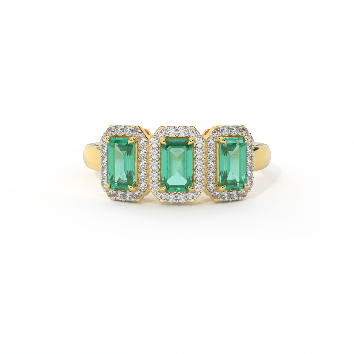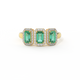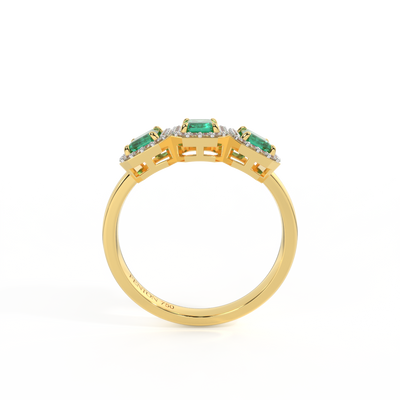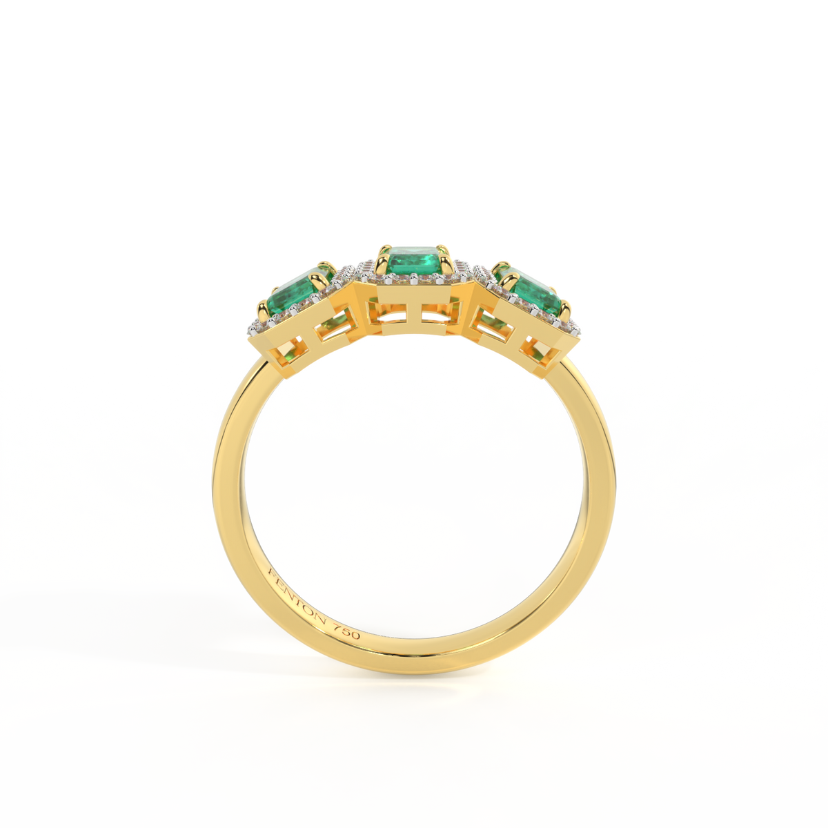 Diese tief sitzende, supertragbare Schönheit erinnert an eine Blumengirlande, eines der universellsten Symbole der Liebe. Drei einzigartige Smaragde im Smaragdschliff sind von Diamanthalos umgeben, wobei jeder Smaragd ein einzigartiger Edelstein ist.