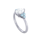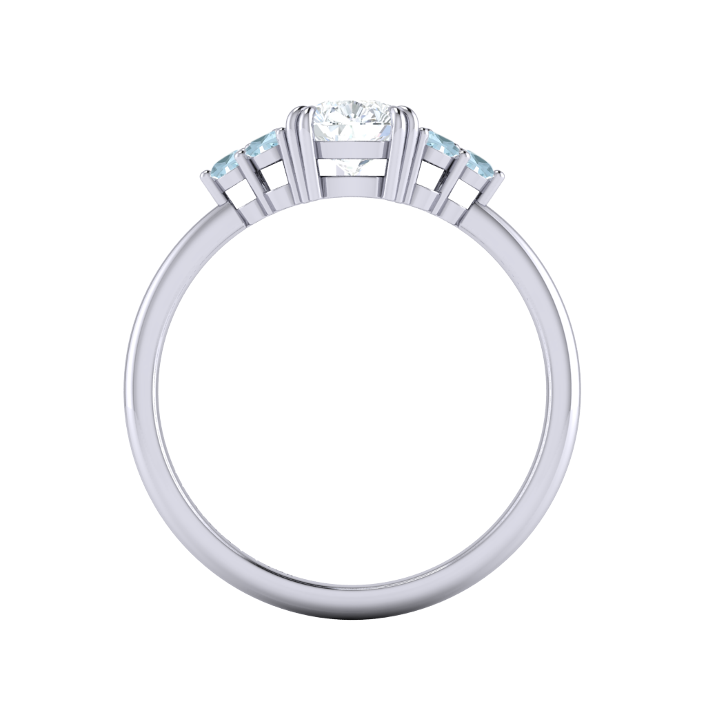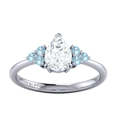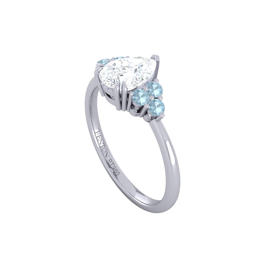 Your glistening undefined Lab Grown Diamond has a GH V/S quality rating and is framed on either side by a trefoil cluster of three 1.8mm round brilliant cut Aquamarine stones, each securely held into place in a claw setting. The design draws the eye to the glistening Lab Grown Diamond centre stone, sitting proudly in a classic open gallery setting crafted from solid Platinum. The open setting of this design allows the light to reflect in all directions, creating a lustrous and sparkling look.