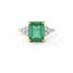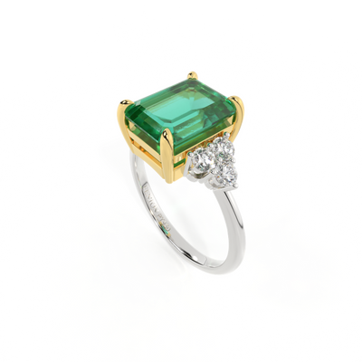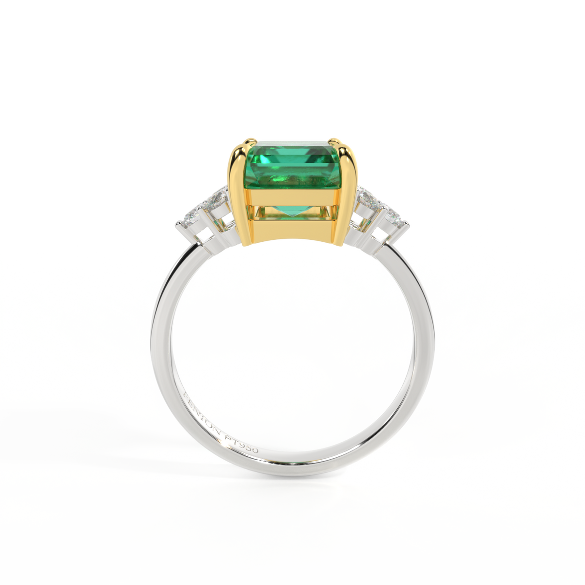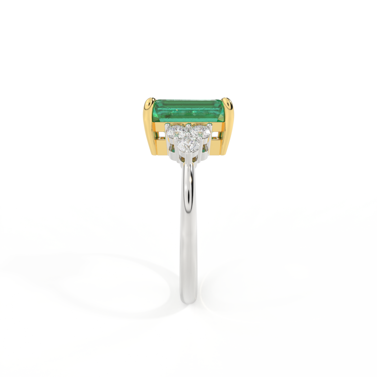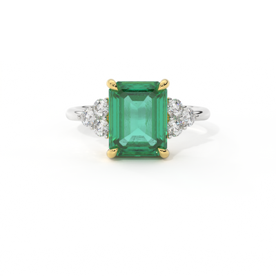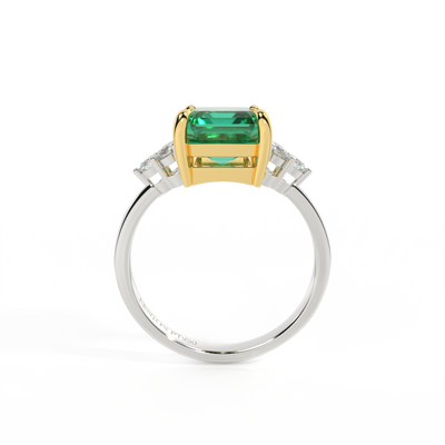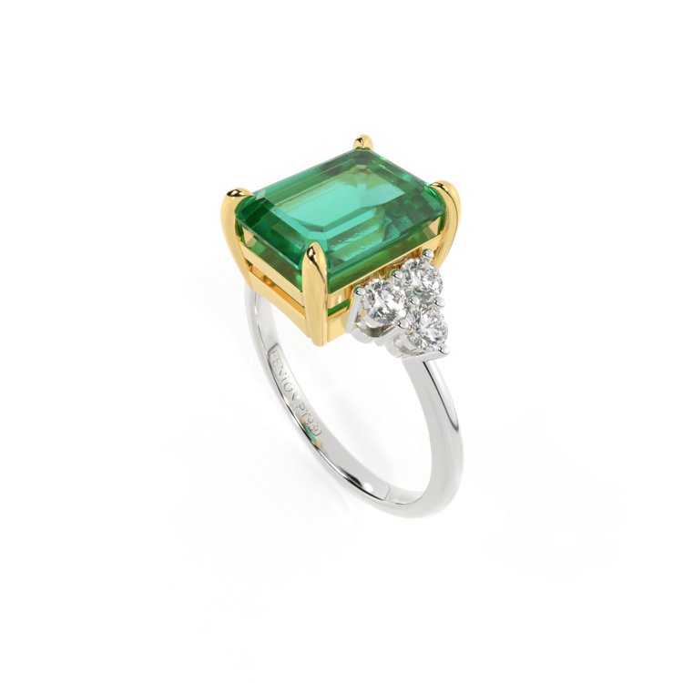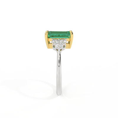 Ihr glitzernder Smaragd Schliff Smaragd wird auf beiden Seiten von drei 1,8 mm großen runden Diamanten im Brillantschliff (GH/VS) eingerahmt, die jeweils sicher in einer Krallenfassung gefasst sind. Das Design lenkt den Blick auf den glitzernden Mittelstein Smaragd, der stolz in einer klassischen, offenen Galerie-Fassung aus massivem, recyceltem 18-karätigem Gold oder Platin sitzt. Die offene Fassung dieses Designs lässt das Licht in alle Richtungen reflektieren und sorgt so für einen glänzenden und funkelnden Look.