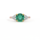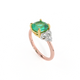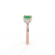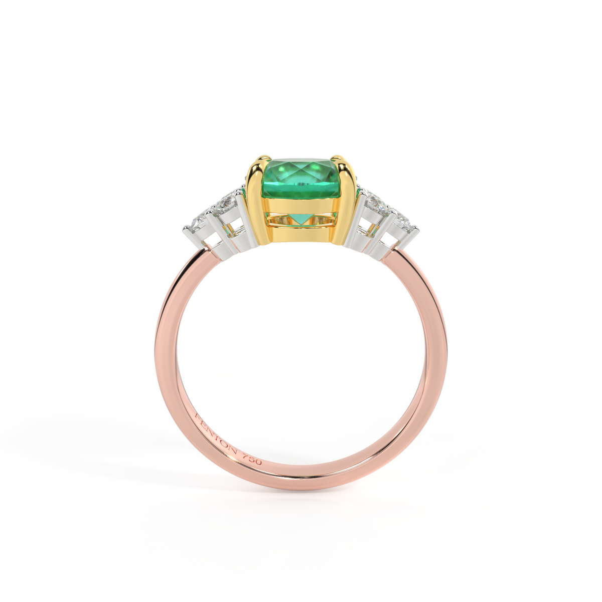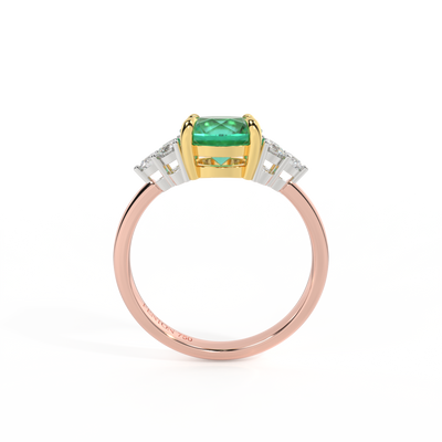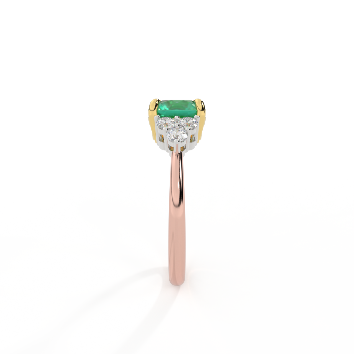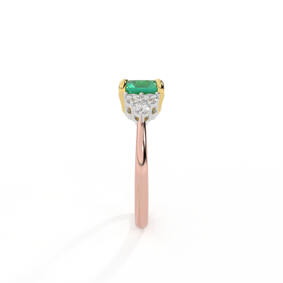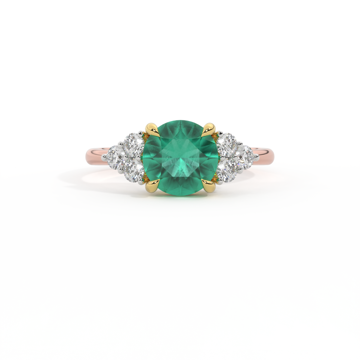 Ihr glitzernder Runden Schliff Smaragd wird auf beiden Seiten von drei 1,8 mm großen runden Diamanten im Brillantschliff (GH/VS) eingerahmt, die jeweils sicher in einer Krallenfassung gefasst sind. Das Design lenkt den Blick auf den glitzernden Mittelstein Smaragd, der stolz in einer klassischen, offenen Galerie-Fassung aus massivem, recyceltem 18-karätigem Gold oder Platin sitzt. Die offene Fassung dieses Designs lässt das Licht in alle Richtungen reflektieren und sorgt so für einen glänzenden und funkelnden Look.