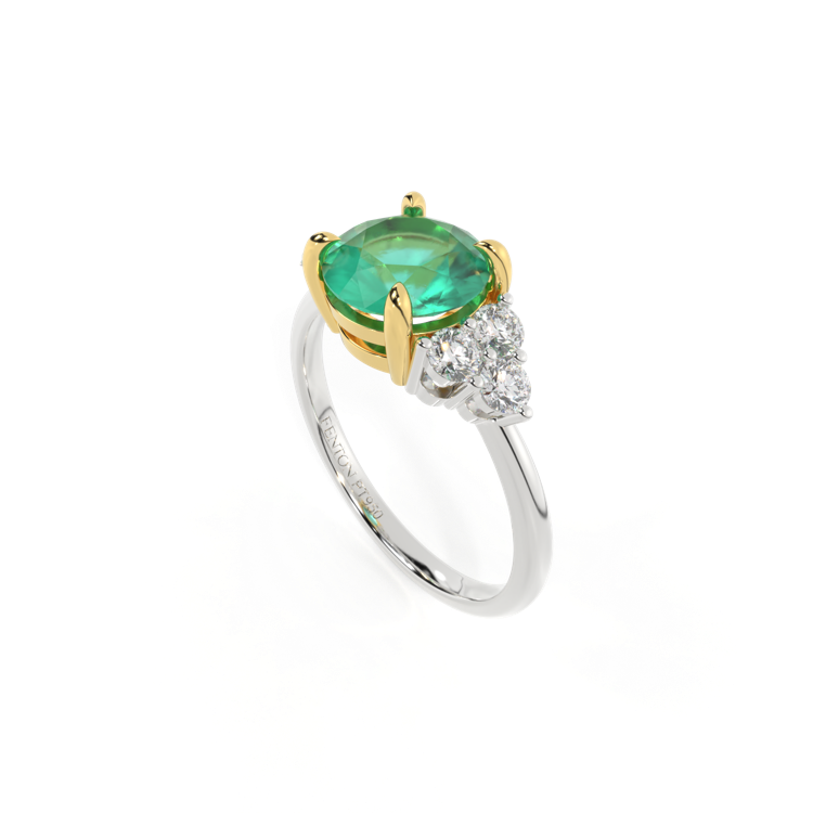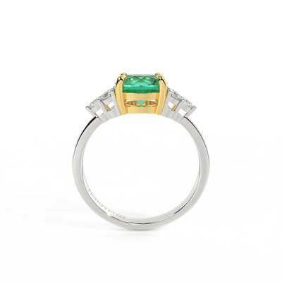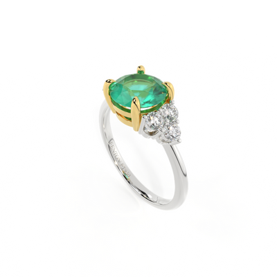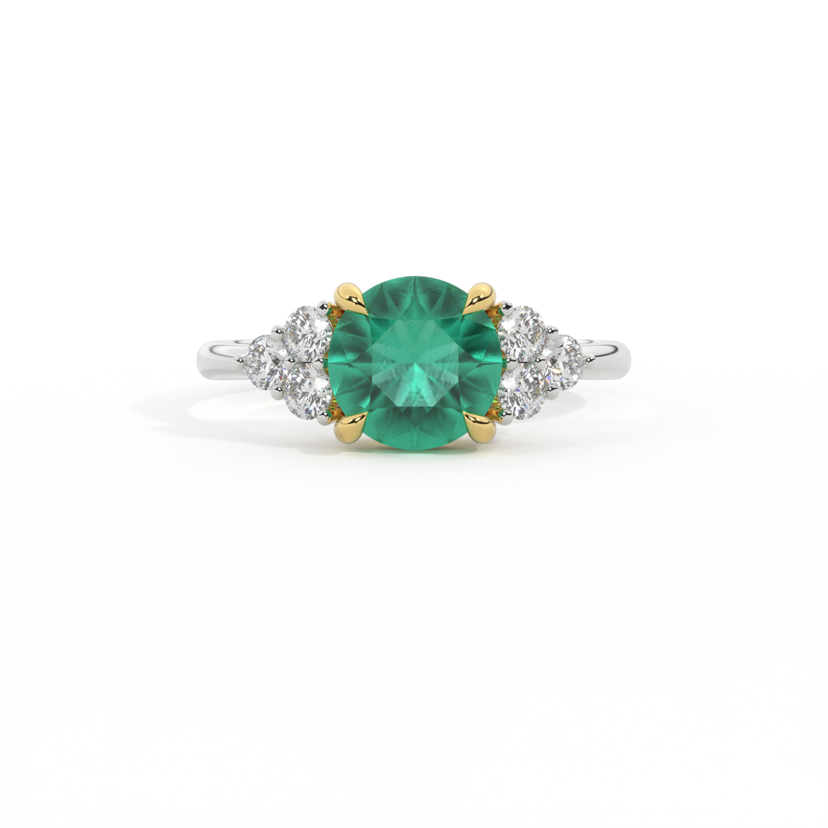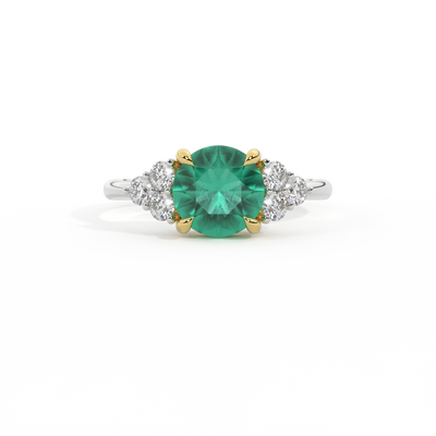 Ihr glitzernder Runden Schliff Smaragd wird auf beiden Seiten von drei 1,8 mm großen runden Diamanten im Brillantschliff (GH/VS) eingerahmt, die jeweils sicher in einer Krallenfassung gefasst sind. Das Design lenkt den Blick auf den glitzernden Mittelstein Smaragd, der stolz in einer klassischen, offenen Galerie-Fassung aus massivem, recyceltem 18-karätigem Gold oder Platin sitzt. Die offene Fassung dieses Designs lässt das Licht in alle Richtungen reflektieren und sorgt so für einen glänzenden und funkelnden Look.