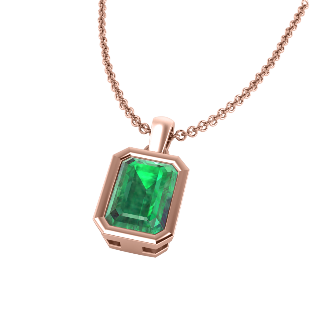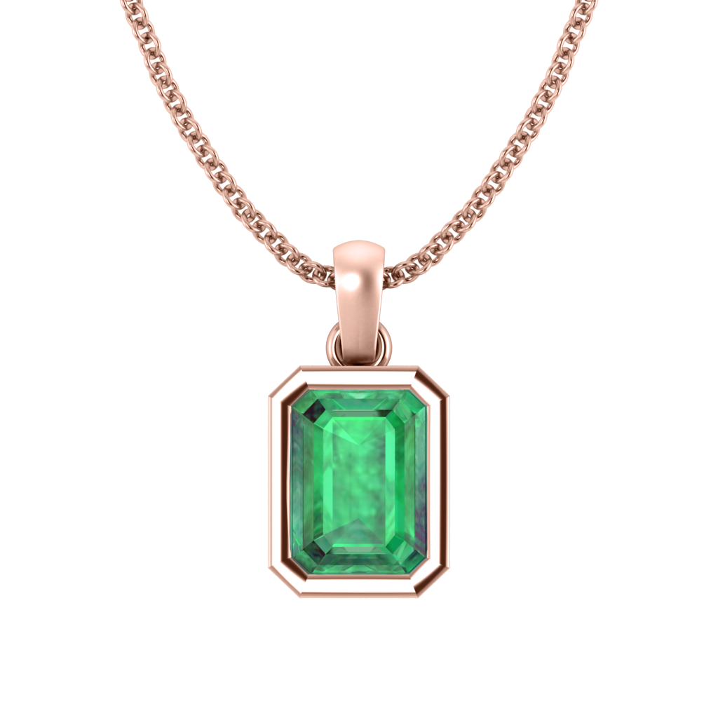 Die Bezel Pendant Necklace verbindet Minimalismus mit moderner Eleganz. Der Smaragd geschliffene Smaragd Anhänger ist in einer 18 Karat Roségold Umrandung eingefasst und balanciert mühelos an einer passenden Kette.