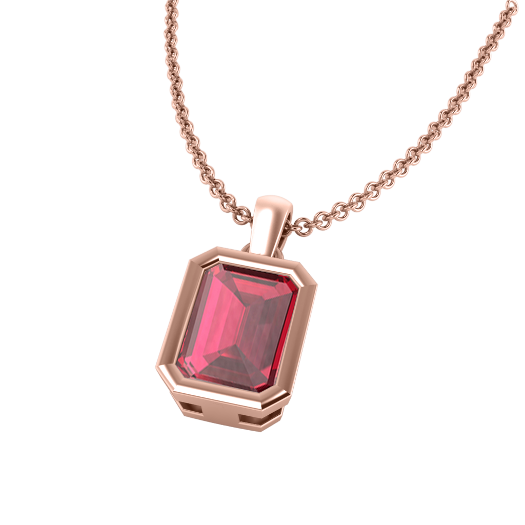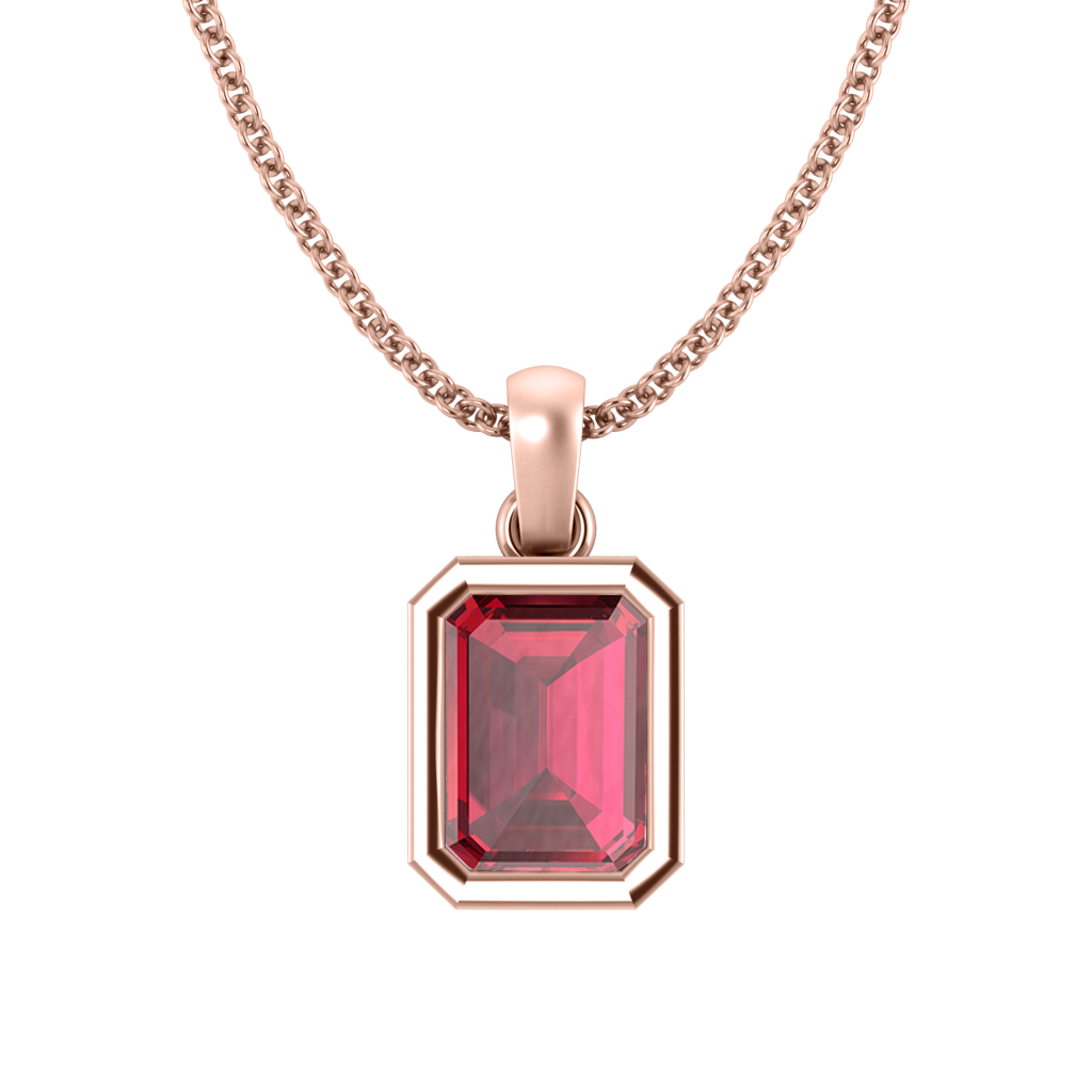 Die Bezel Pendant Necklace verbindet Minimalismus mit moderner Eleganz. Der Smaragd geschliffene Rubin Anhänger ist in einer 18 Karat Roségold Umrandung eingefasst und balanciert mühelos an einer passenden Kette.