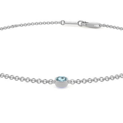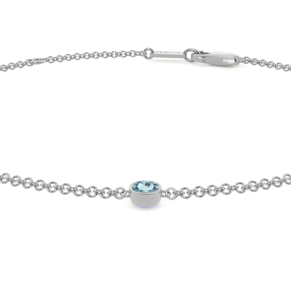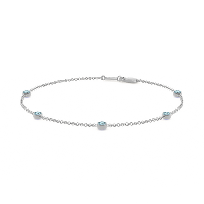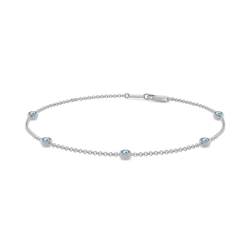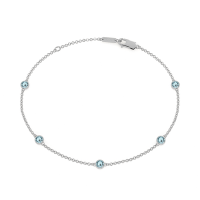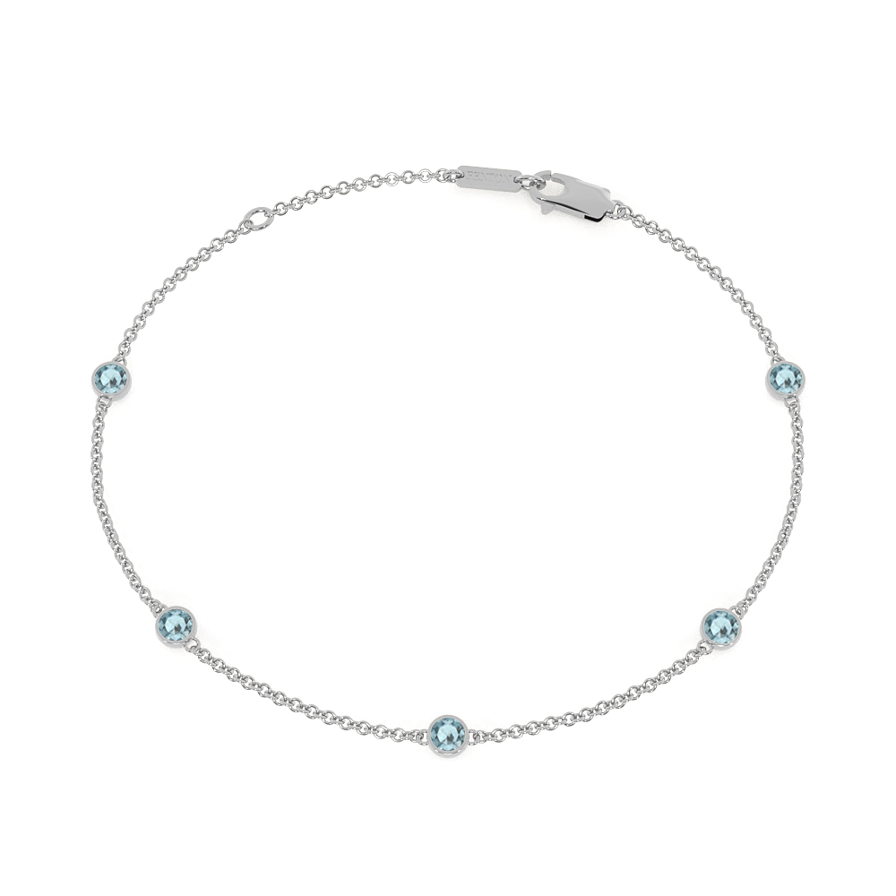 Unser Five Stone Bezel Aquamarin Armband bringt die Schönheit der minimalistischen Eleganz zum Vorschein. Die klassische Kette 18 Karat Weißgold trägt fünf glitzernde, 3 mm große Steine im Rundschliff Aquamarin, die jeweils in einer modernen Bezel-Fassung befestigt sind und ein perfektes, alltagstaugliches Armband und ein müheloses, funkelndes Statement an Ihrem Handgelenk bilden.