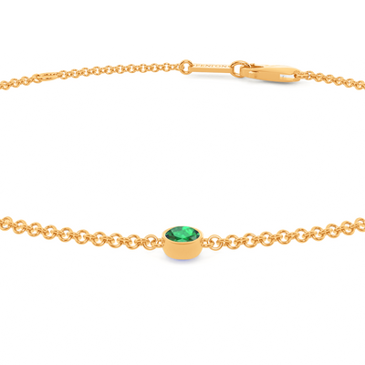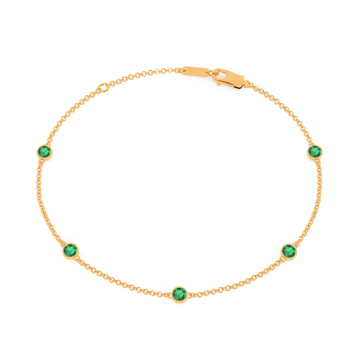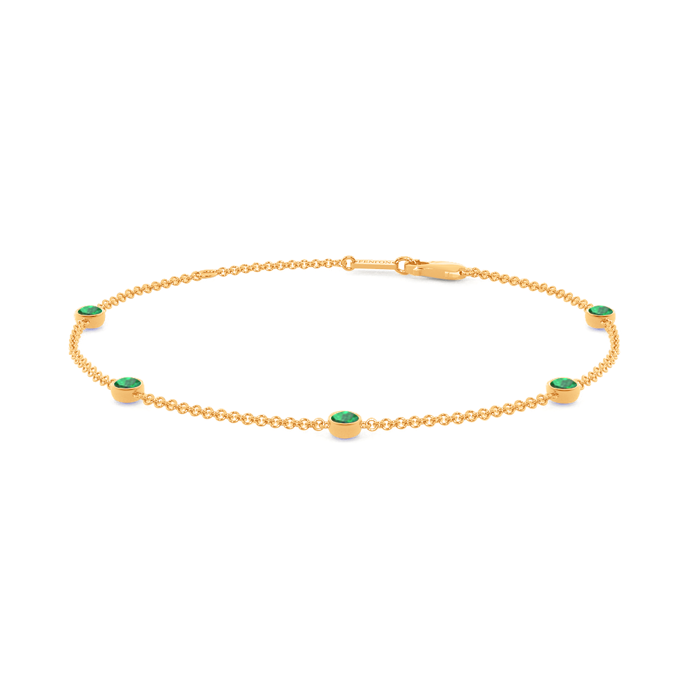 Unser Five Stone Bezel Smaragd Armband bringt die Schönheit der minimalistischen Eleganz zum Vorschein. Die klassische Kette 18 Karat Gelbgold trägt fünf glitzernde, 3 mm große Steine im Rundschliff Smaragd, die jeweils in einer modernen Bezel-Fassung befestigt sind und ein perfektes, alltagstaugliches Armband und ein müheloses, funkelndes Statement an Ihrem Handgelenk bilden.
