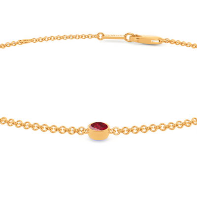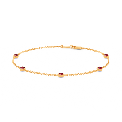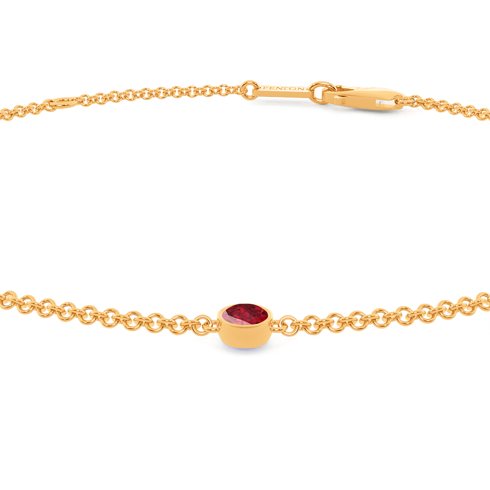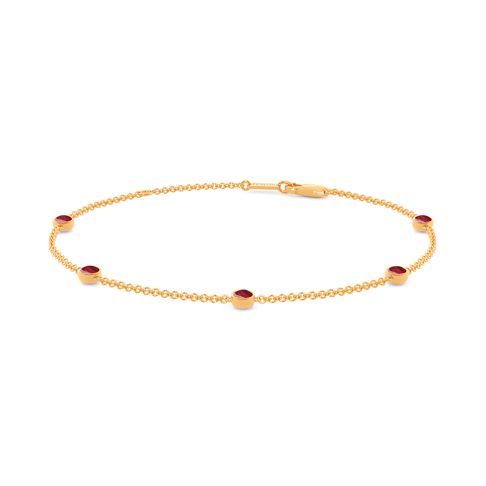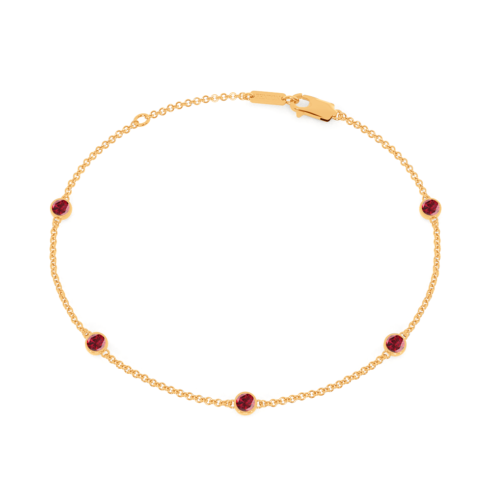 Unser Five Stone Bezel Rubin Armband bringt die Schönheit der minimalistischen Eleganz zum Vorschein. Die klassische Kette 18 Karat Gelbgold trägt fünf glitzernde, 3 mm große Steine im Rundschliff Rubin, die jeweils in einer modernen Bezel-Fassung befestigt sind und ein perfektes, alltagstaugliches Armband und ein müheloses, funkelndes Statement an Ihrem Handgelenk bilden.