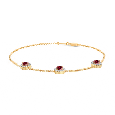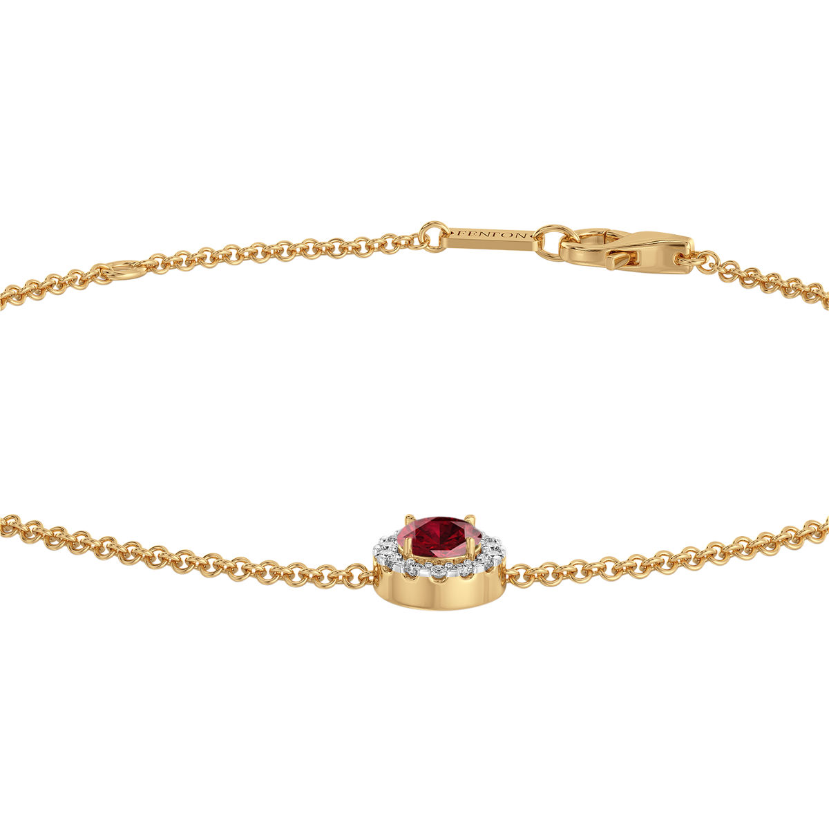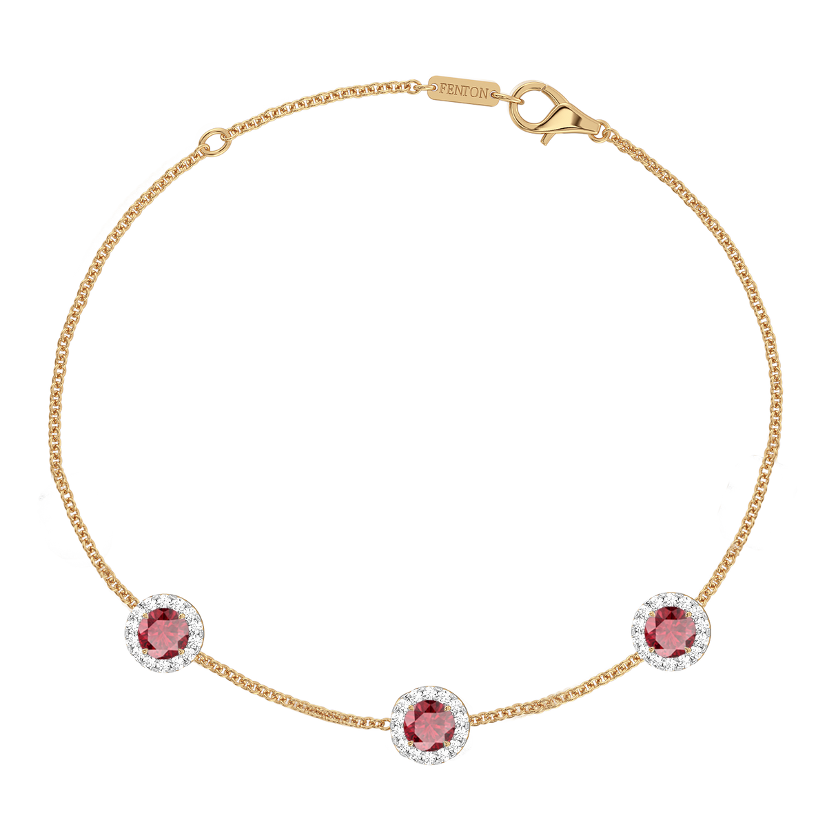 Das Garland Armband in Rubin vereint feminine Romantik und zeitlosen Stil. Dieses zarte Design mit drei Runden Rubin Steinen in einer klassischen Krallenfassung, umgeben von einem glitzernden Halo aus Diamanten der Farbe G/H und der Reinheit VS, ist ein Schmuckstück, das man für immer in Ehren hält. Das Design mit drei Steinen ist ein Favorit von Fenton und erinnert an eine Blumengirlande, eines der universellsten Symbole der Liebe.