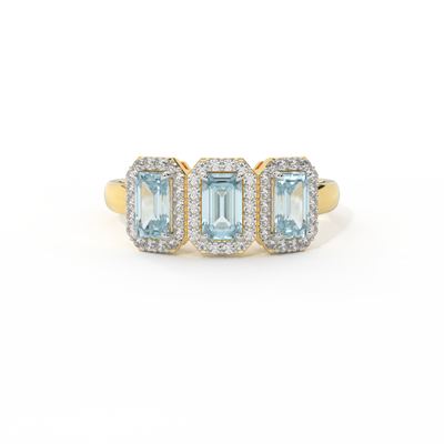 Diese niedrig gefasste, super tragbare Schönheit erinnert an eine florale Girlande, eines der universellsten Symbole der Liebe. Drei Smaragd geschliffene Aquamarin Steine sind von diamantbesetzten Halos umgeben, jeder Stein ist ein absolutes Unikat.