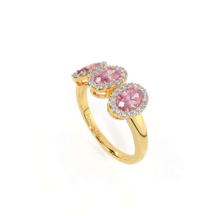 Diese niedrig gefasste, super tragbare Schönheit erinnert an eine florale Girlande, eines der universellsten Symbole der Liebe. Drei Oval geschliffene Rosa Saphir Steine sind von diamantbesetzten Halos umgeben, jeder Stein ist ein absolutes Unikat.