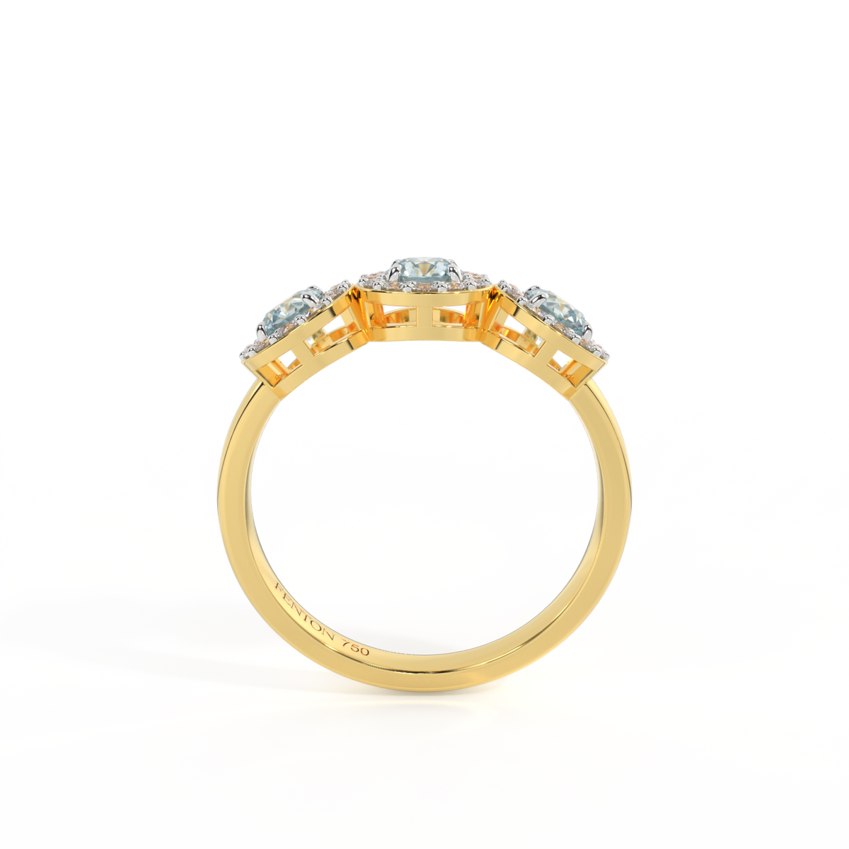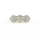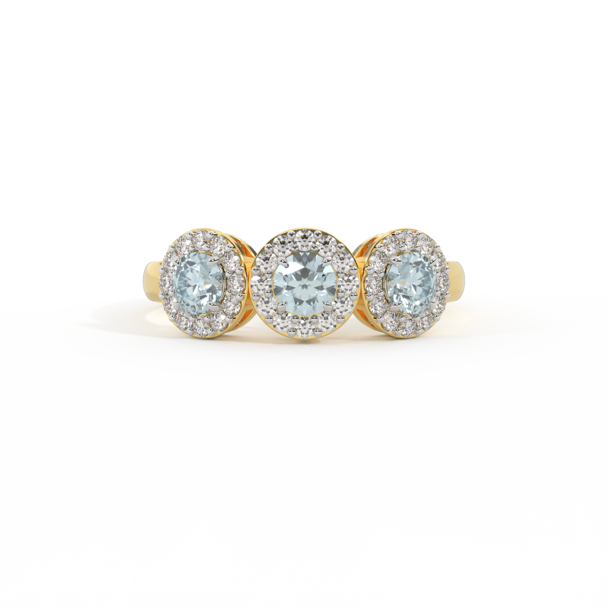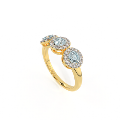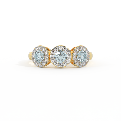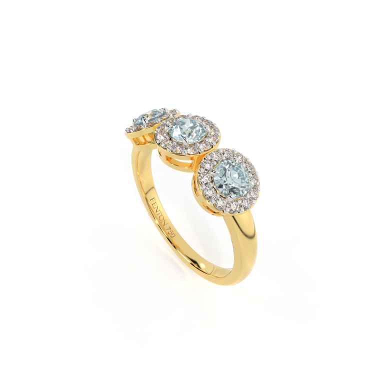 Diese niedrig gefasste, super tragbare Schönheit erinnert an eine florale Girlande, eines der universellsten Symbole der Liebe. Drei Runden geschliffene Aquamarin Steine sind von diamantbesetzten Halos umgeben, jeder Stein ist ein absolutes Unikat.