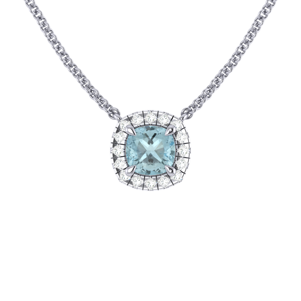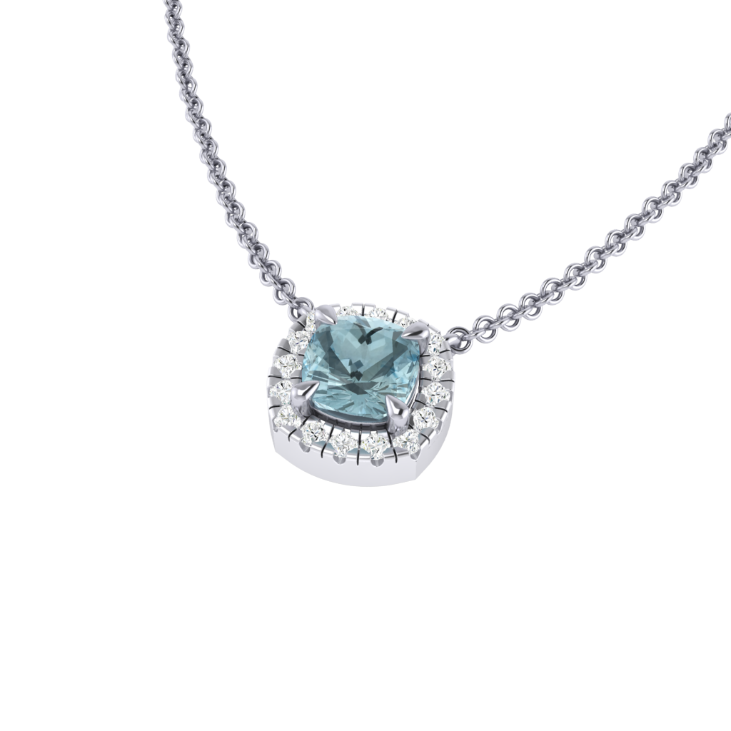 Die klassische Halskette ist das perfekte Geschenk für jeden Anlass. Eine massive 18 Karat Weißgold Kette hält einen funkelnden Kissen Schliff Aquamarin in der Mitte Ihrer Halskette, umgeben von einem Halo aus runden Diamanten im Brillantschliffpavé der Farbe G/H und Reinheit VS. Die Classic Necklace ist die perfekte Kombination aus feinster Handwerkskunst und schlichter Eleganz.