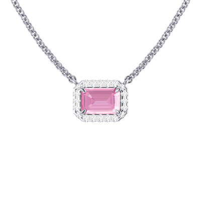 Die klassische Halskette ist das perfekte Geschenk für jeden Anlass. Eine massive 18 Karat Weißgold Kette hält einen funkelnden Smaragd Schliff Rosa Saphir in der Mitte Ihrer Halskette, umgeben von einem Halo aus runden Diamanten im Brillantschliffpavé der Farbe G/H und Reinheit VS. Die Classic Necklace ist die perfekte Kombination aus feinster Handwerkskunst und schlichter Eleganz.