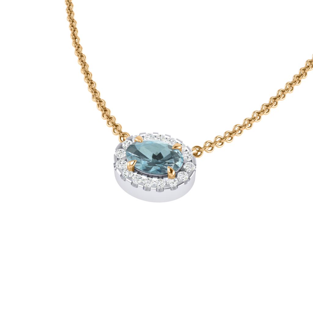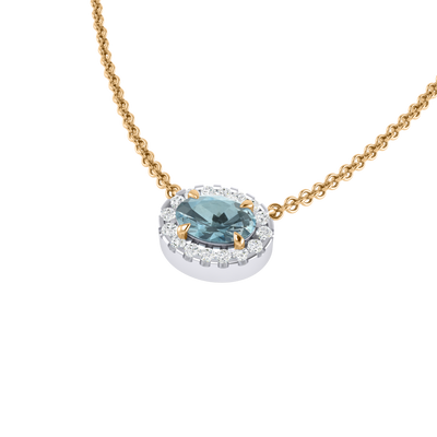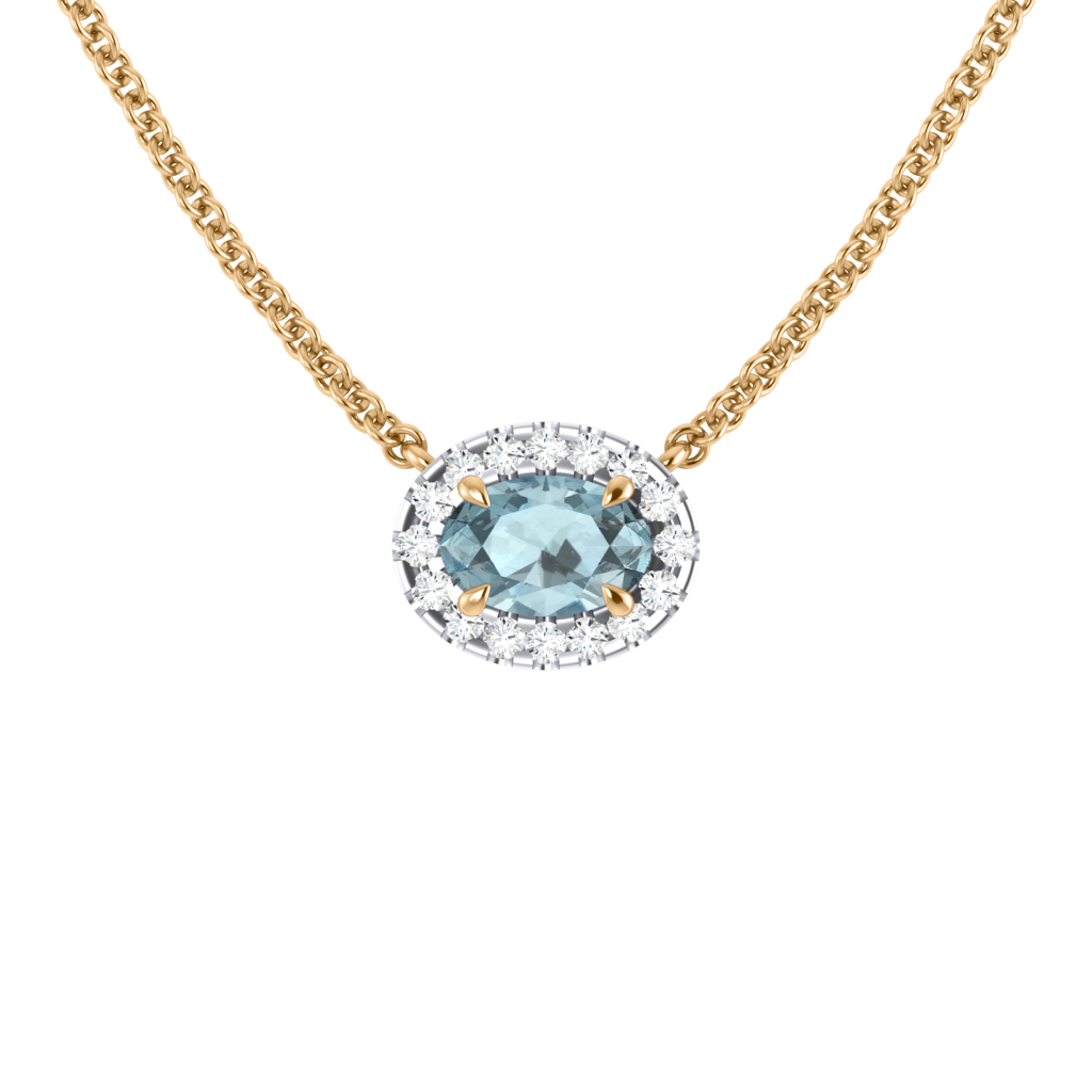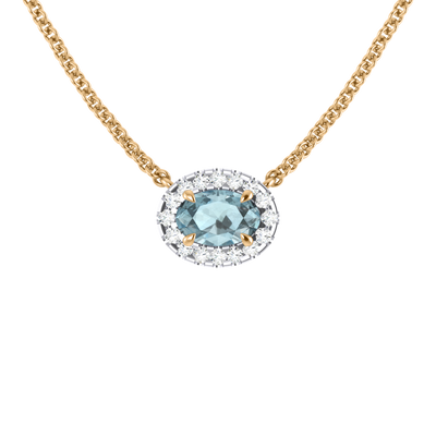 Die klassische Halskette ist das perfekte Geschenk für jeden Anlass. Eine massive 18 Karat Gelbgold Kette hält einen funkelnden Oval Schliff Aquamarin in der Mitte Ihrer Halskette, umgeben von einem Halo aus runden Diamanten im Brillantschliffpavé der Farbe G/H und Reinheit VS. Die Classic Necklace ist die perfekte Kombination aus feinster Handwerkskunst und schlichter Eleganz.
