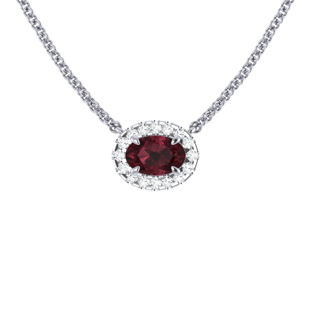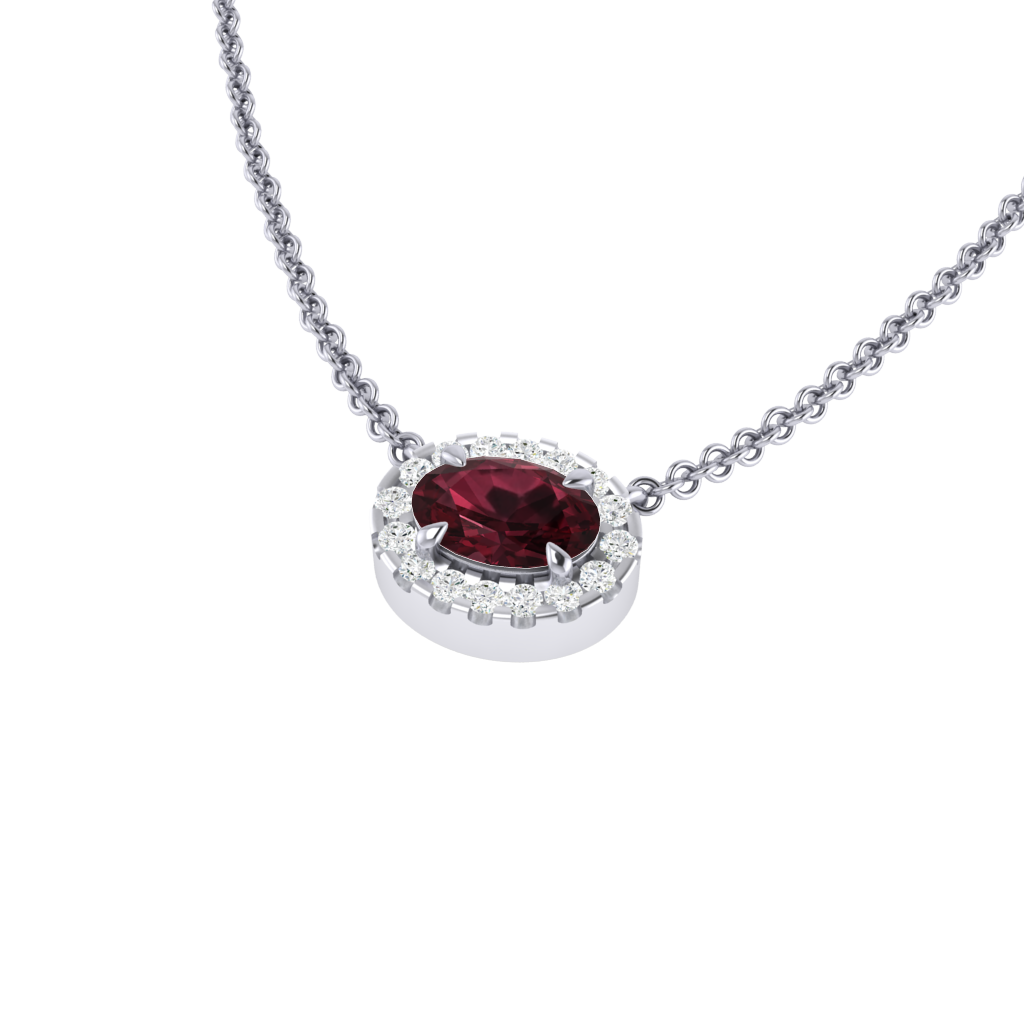 Die klassische Halskette ist das perfekte Geschenk für jeden Anlass. Eine massive 18 Karat Weißgold Kette hält einen funkelnden Oval Schliff Granat in der Mitte Ihrer Halskette, umgeben von einem Halo aus runden Diamanten im Brillantschliffpavé der Farbe G/H und Reinheit VS. Die Classic Necklace ist die perfekte Kombination aus feinster Handwerkskunst und schlichter Eleganz.