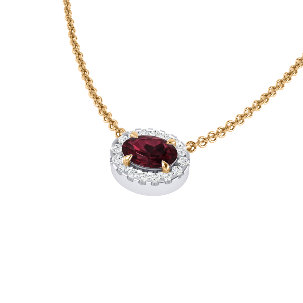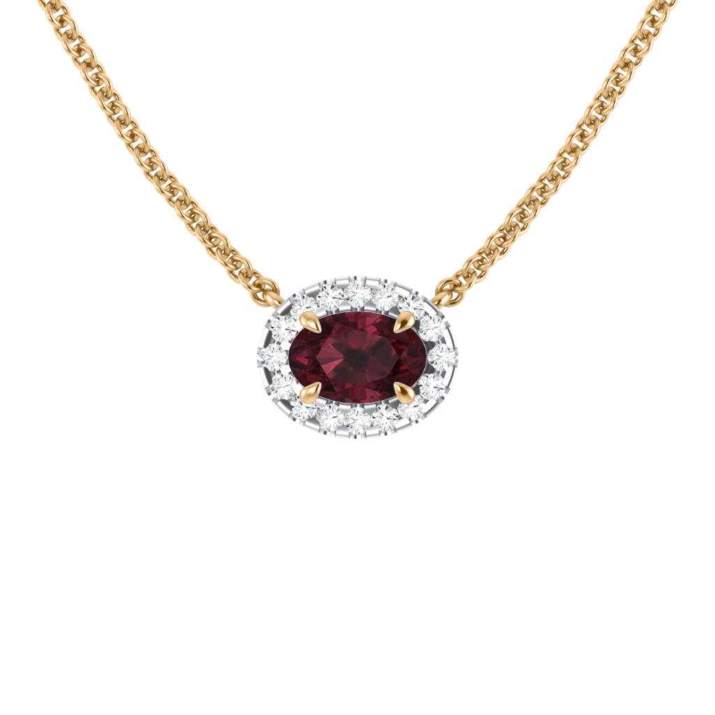 Die klassische Halskette ist das perfekte Geschenk für jeden Anlass. Eine massive 18 Karat Gelbgold Kette hält einen funkelnden Oval Schliff Granat in der Mitte Ihrer Halskette, umgeben von einem Halo aus runden Diamanten im Brillantschliffpavé der Farbe G/H und Reinheit VS. Die Classic Necklace ist die perfekte Kombination aus feinster Handwerkskunst und schlichter Eleganz.