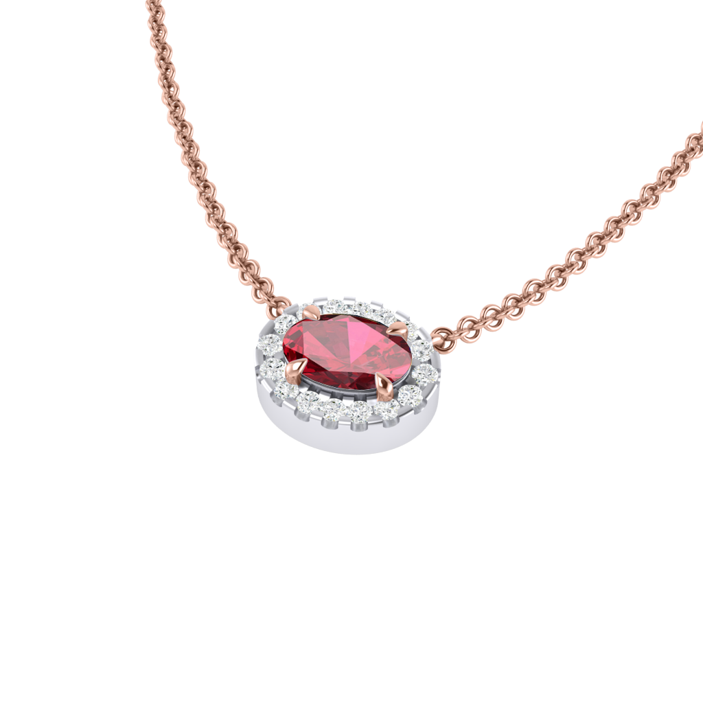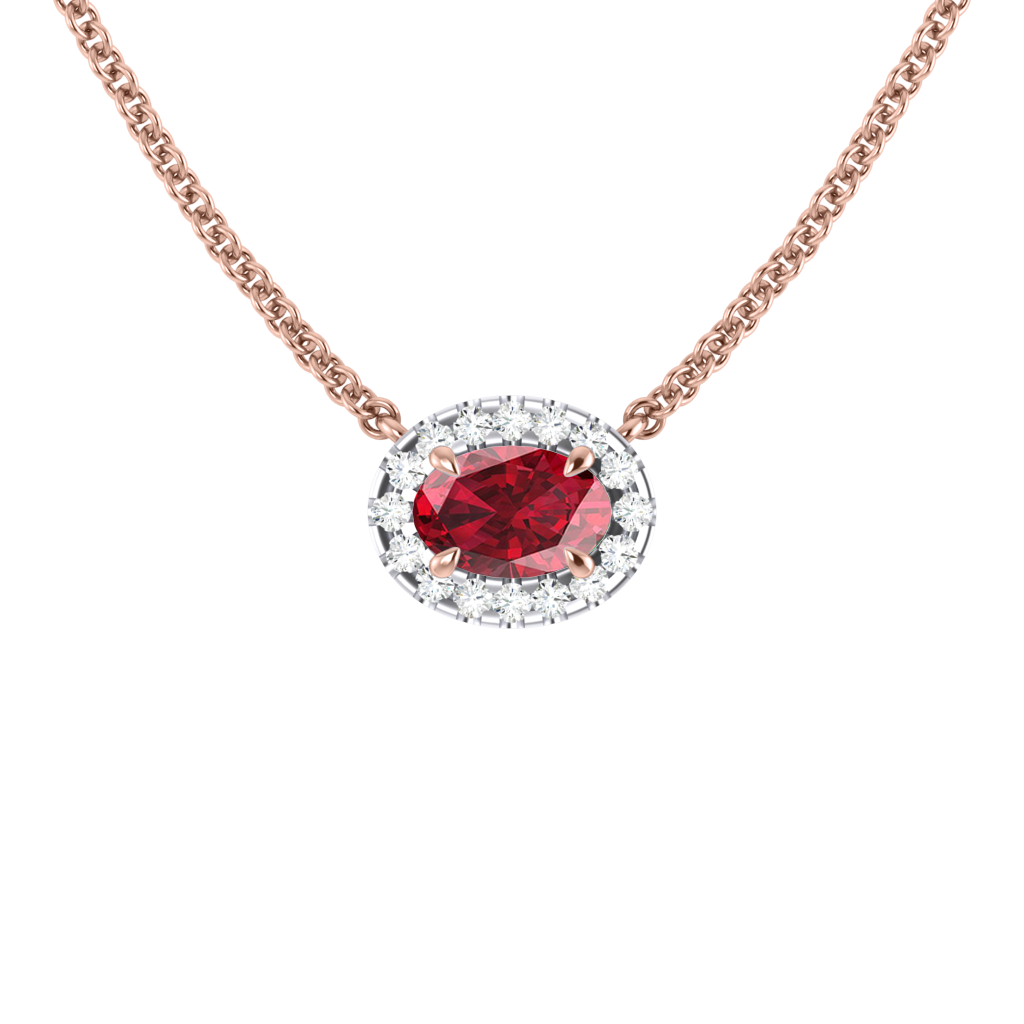 Die klassische Halskette ist das perfekte Geschenk für jeden Anlass. Eine massive 18 Karat Roségold Kette hält einen funkelnden Oval Schliff Rubin in der Mitte Ihrer Halskette, umgeben von einem Halo aus runden Diamanten im Brillantschliffpavé der Farbe G/H und Reinheit VS. Die Classic Necklace ist die perfekte Kombination aus feinster Handwerkskunst und schlichter Eleganz.