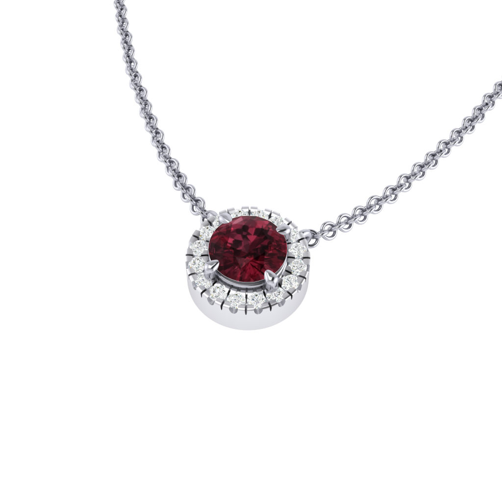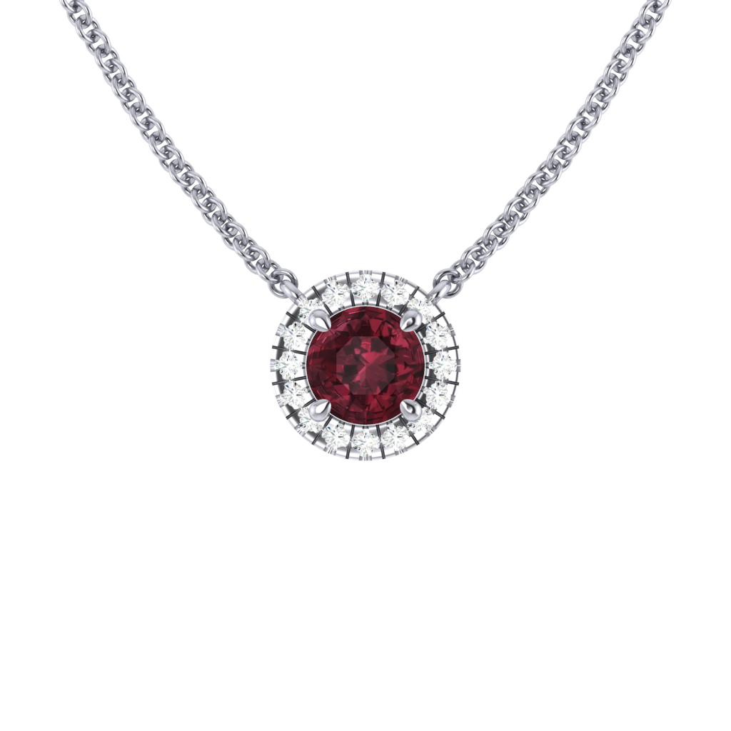 Die klassische Halskette ist das perfekte Geschenk für jeden Anlass. Eine massive 18 Karat Weißgold Kette hält einen funkelnden Runden Schliff Granat in der Mitte Ihrer Halskette, umgeben von einem Halo aus runden Diamanten im Brillantschliffpavé der Farbe G/H und Reinheit VS. Die Classic Necklace ist die perfekte Kombination aus feinster Handwerkskunst und schlichter Eleganz.