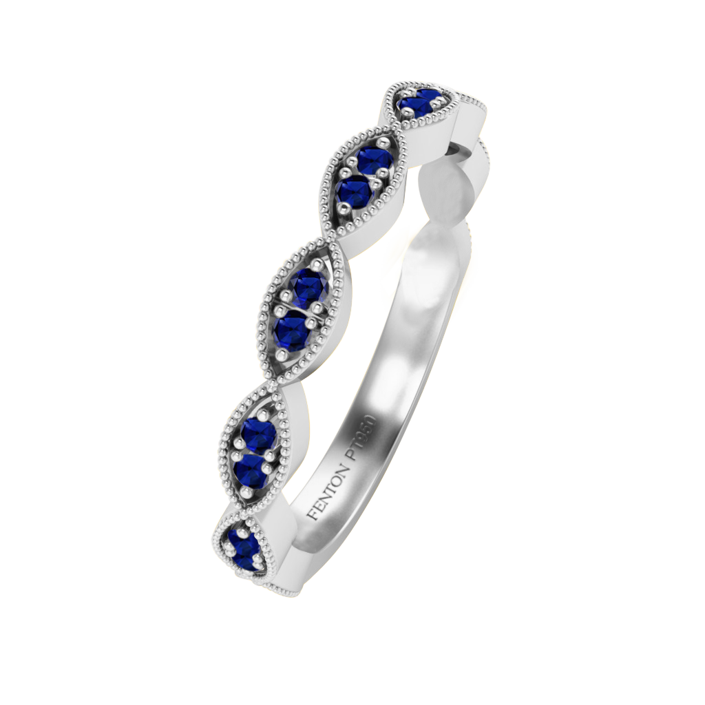 Inspiriert von den Lorbeerkränzen römischer Sieger, ist unser Laurel Ring eine stilvolle Wahl für einen besonderen Anlass oder als Ehering. Das Design des Laurel Rings ist klassisch und modern zugleich mit einem Hauch Romatik. Der Ring ist aus Platin gefertigt und trägt ca. 0.15-karätige Blauer Saphir Steine, abwelchselnd in den kreierten Lorbeerblättern dieses Designs umfasst.Die Blauer Saphir Akzente verteilen sich über 3/4 Ihres glitzendern Ringes.