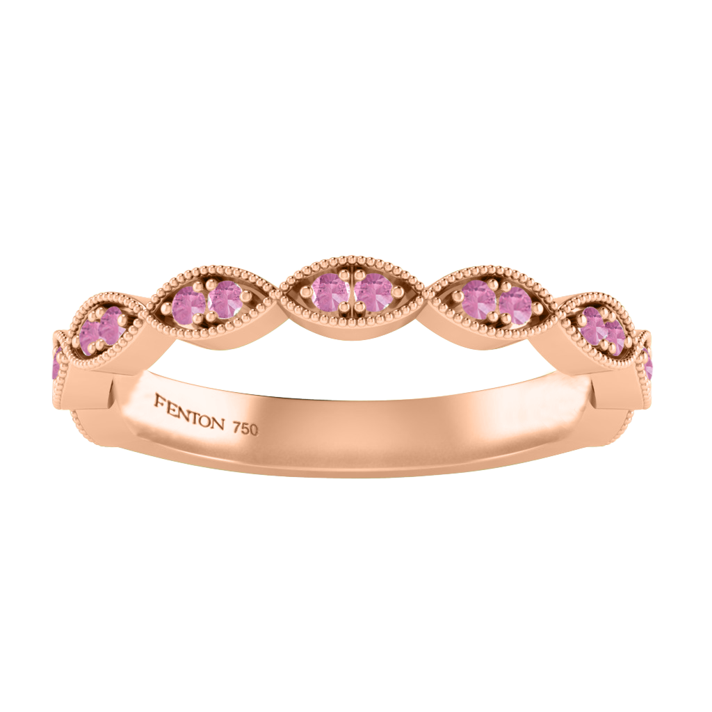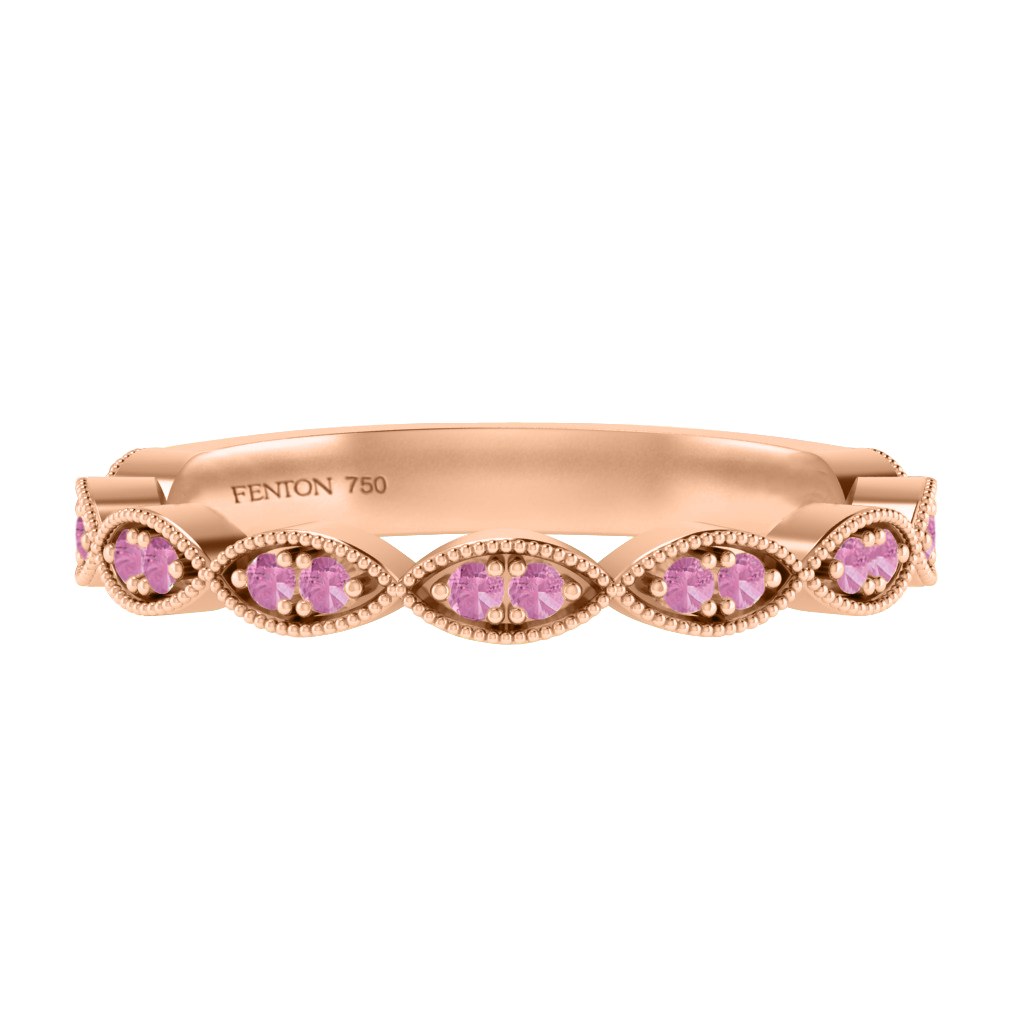Inspiriert von den Lorbeerkränzen römischer Sieger, ist unser Laurel Ring eine stilvolle Wahl für einen besonderen Anlass oder als Ehering. Das Design des Laurel Rings ist klassisch und modern zugleich mit einem Hauch Romatik. Der Ring ist aus 18 Karat Roségold gefertigt und trägt ca. 0.15-karätige Rosa Saphir Steine, abwelchselnd in den kreierten Lorbeerblättern dieses Designs umfasst.Die Rosa Saphir Akzente verteilen sich über 3/4 Ihres glitzendern Ringes.