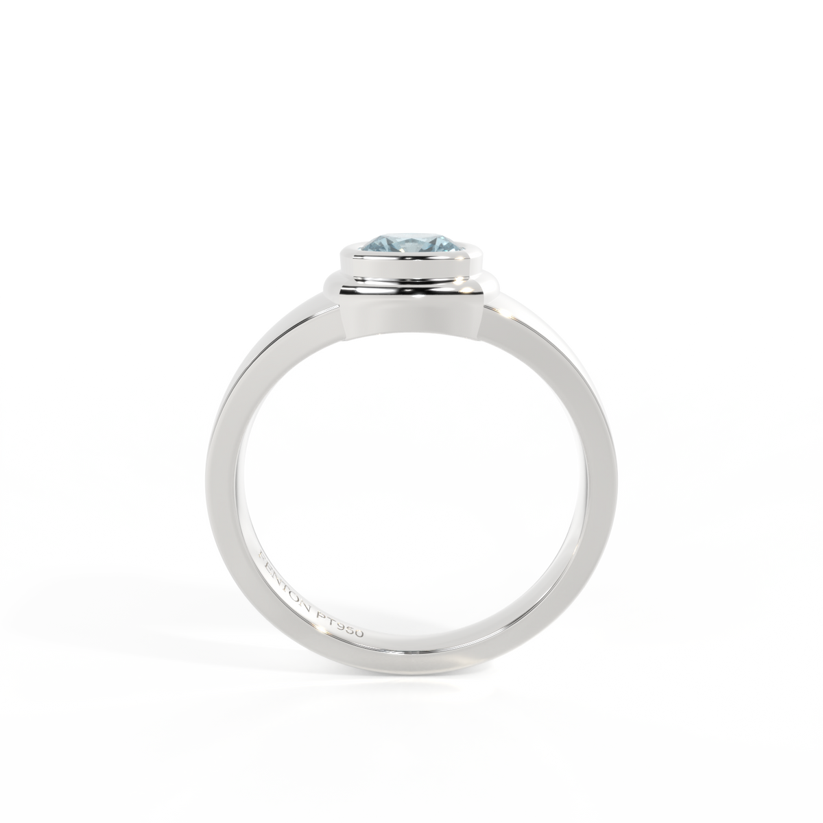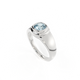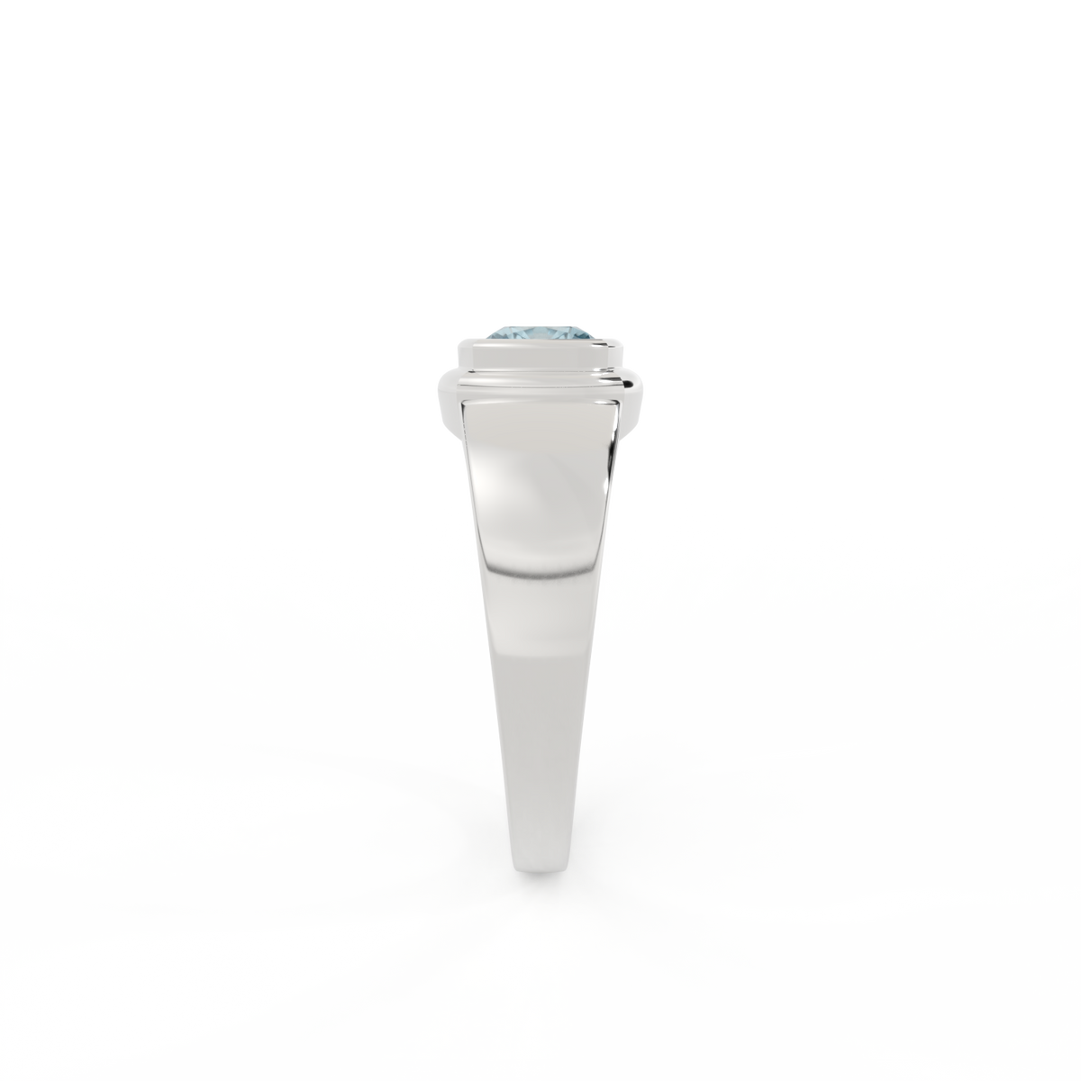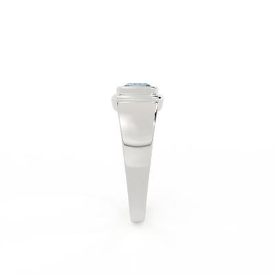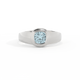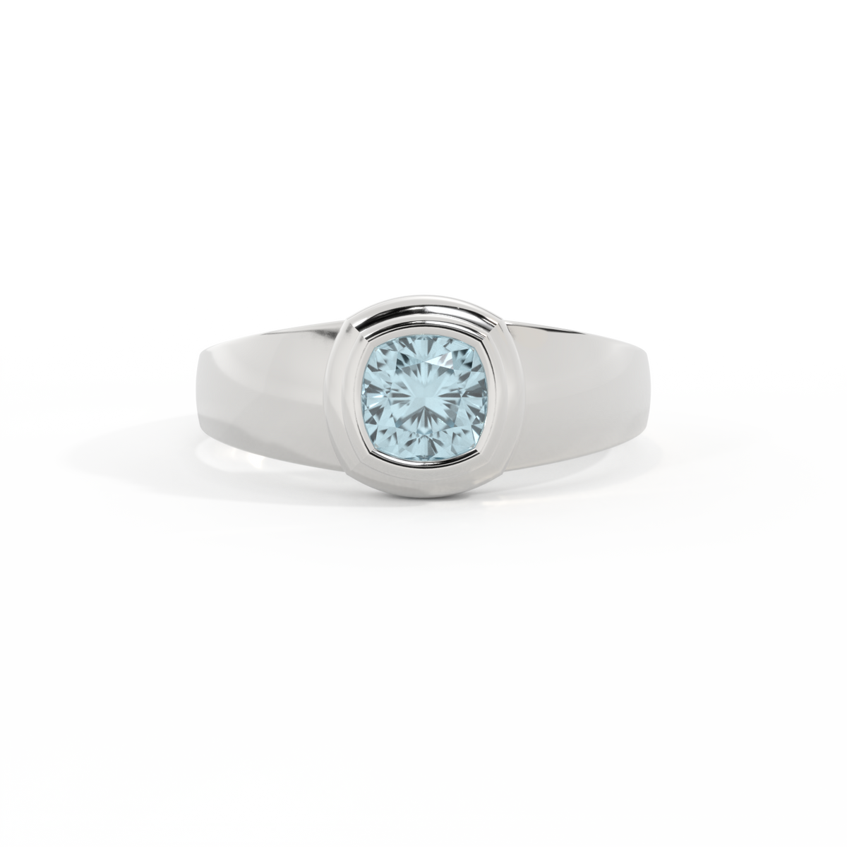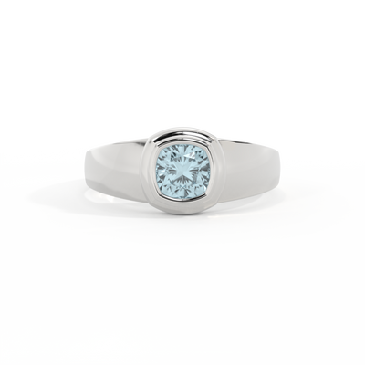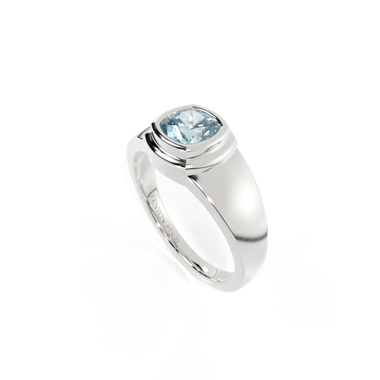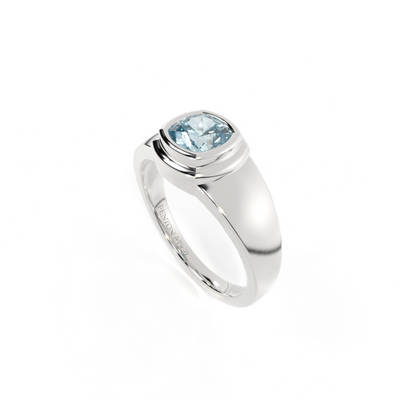 Dieses ikonische Schmuckstück ist mit einem Kissen geschliffenen Aquamarin besetzt, der in einer gestuften Lünettenfassung leicht über dem 18 Karat Weißgold Band sitzt. Die Schultern verjüngen sich zur Mitte hin, und der abgerundete Schaft sorgt für maximalen Tragekomfort. Ein modernes Erbstück für jeden Tag.