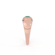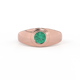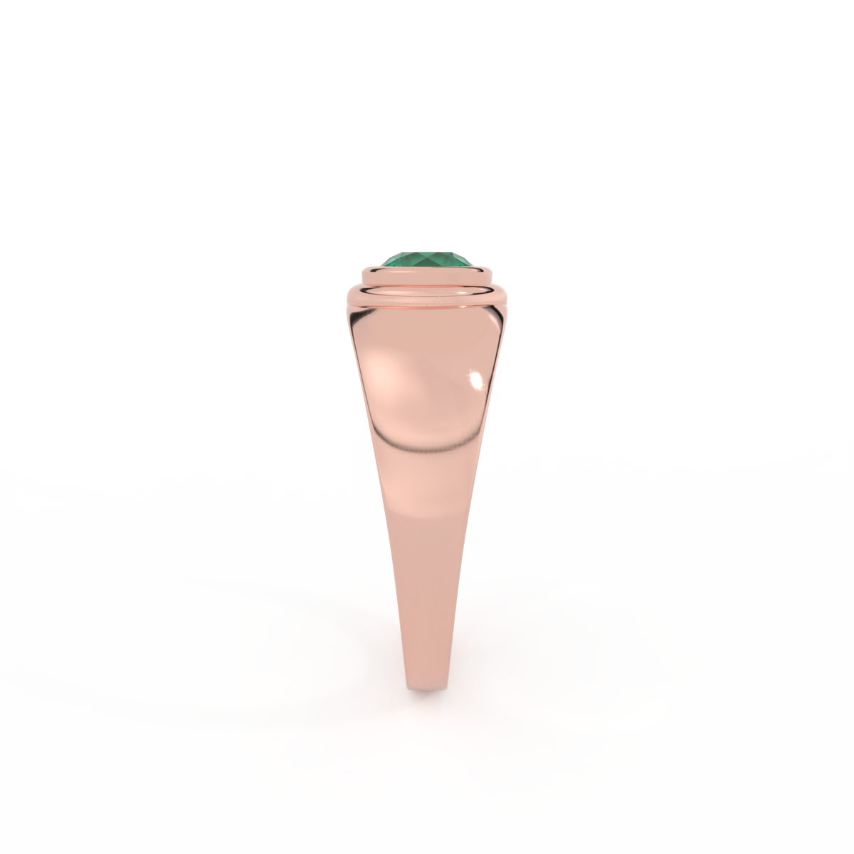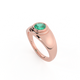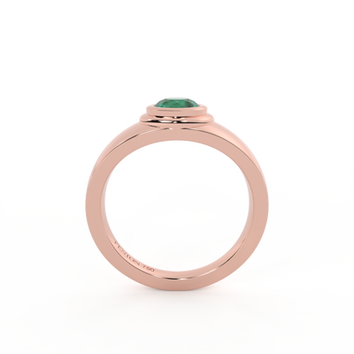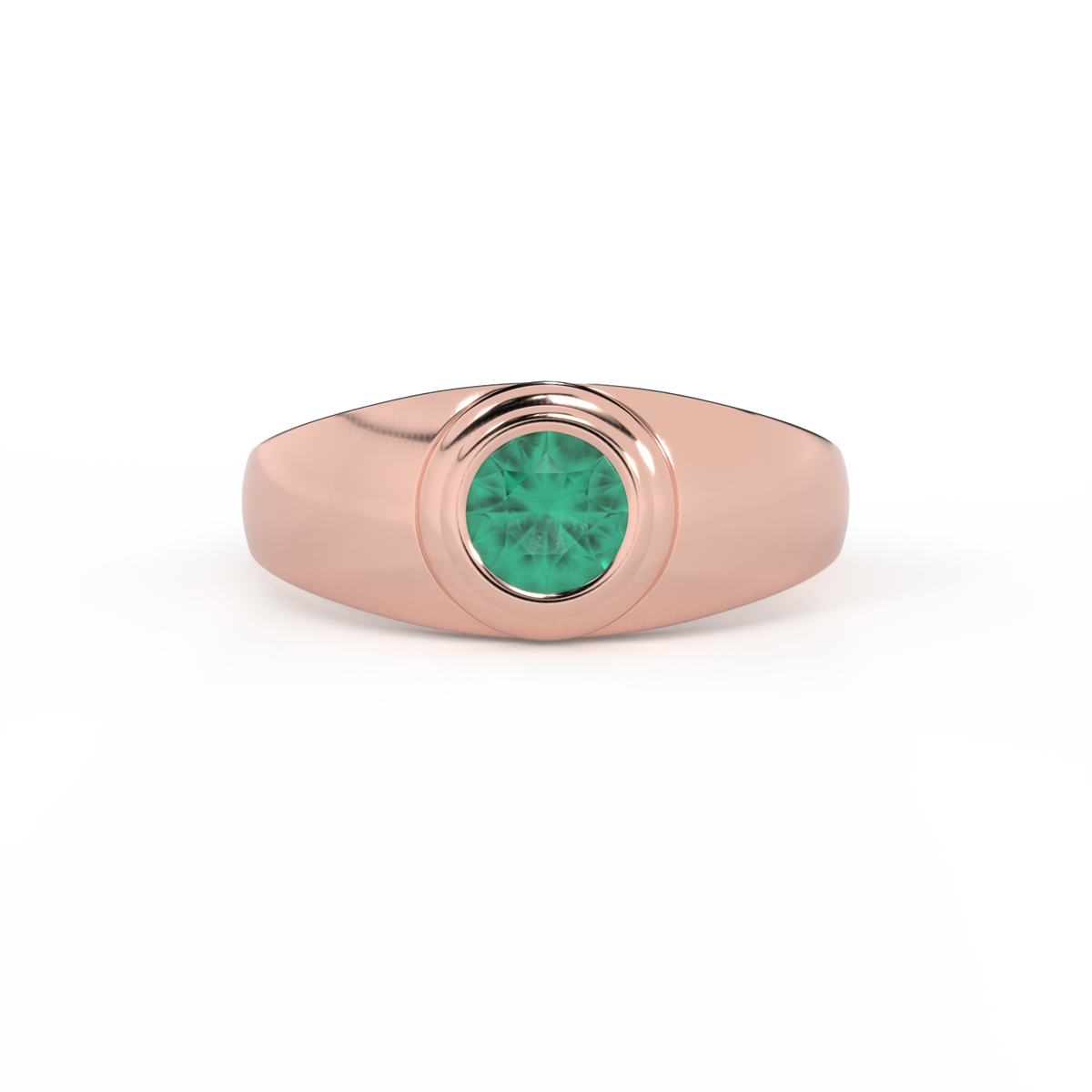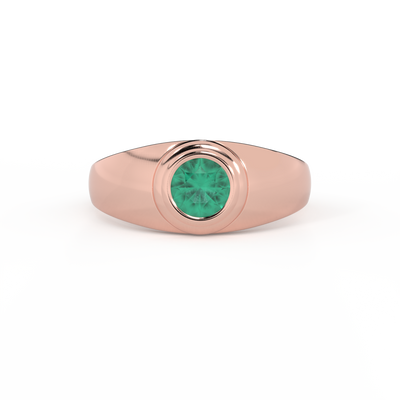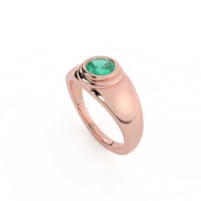 Dieses ikonische Schmuckstück ist mit einem Runden geschliffenen Smaragd besetzt, der in einer gestuften Lünettenfassung leicht über dem 18 Karat Roségold Band sitzt. Die Schultern verjüngen sich zur Mitte hin, und der abgerundete Schaft sorgt für maximalen Tragekomfort. Ein modernes Erbstück für jeden Tag.