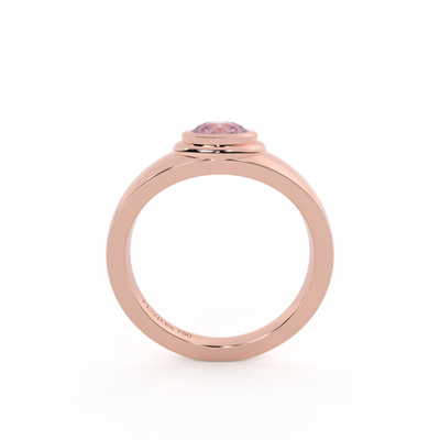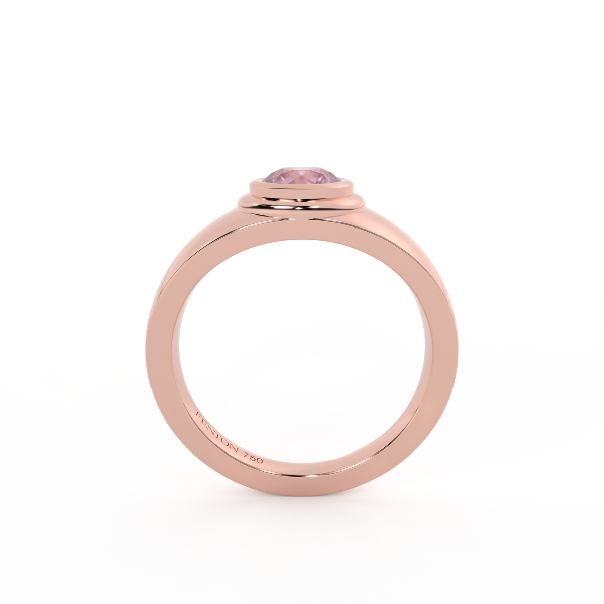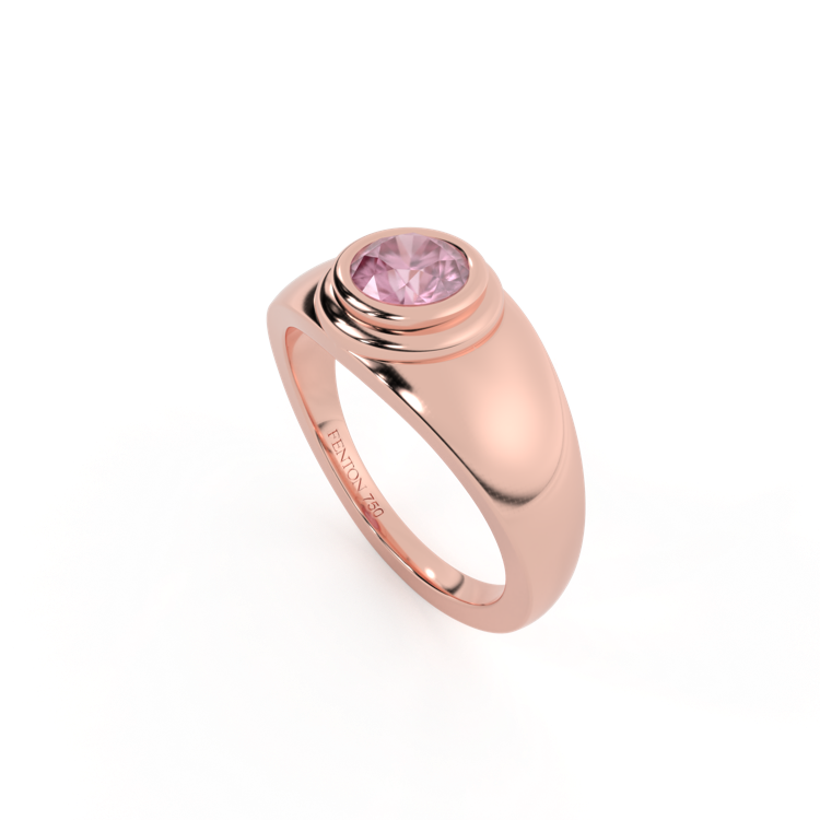 Dieses ikonische Schmuckstück ist mit einem Runden geschliffenen Rosa Saphir besetzt, der in einer gestuften Lünettenfassung leicht über dem 18 Karat Roségold Band sitzt. Die Schultern verjüngen sich zur Mitte hin, und der abgerundete Schaft sorgt für maximalen Tragekomfort. Ein modernes Erbstück für jeden Tag.