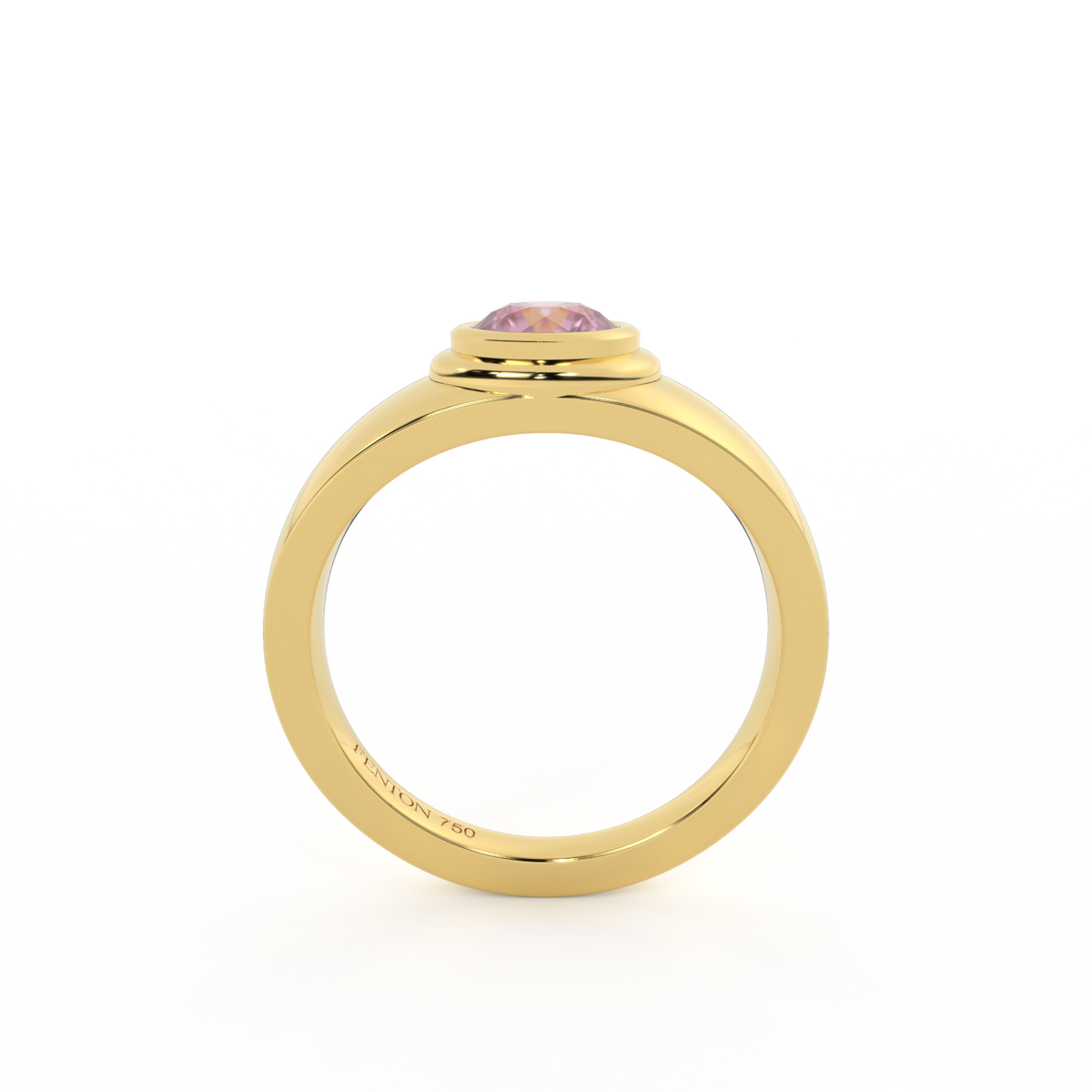 Dieses ikonische Schmuckstück ist mit einem Runden geschliffenen Rosa Saphir besetzt, der in einer gestuften Lünettenfassung leicht über dem 18 Karat Gelbgold Band sitzt. Die Schultern verjüngen sich zur Mitte hin, und der abgerundete Schaft sorgt für maximalen Tragekomfort. Ein modernes Erbstück für jeden Tag.