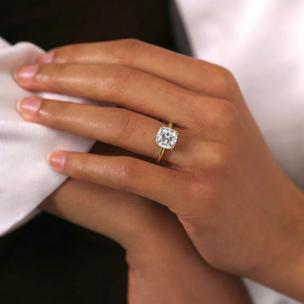 Lab Grown Solar Diamond Solitaire Cushion Cut 18k Yellow Gold Ring
