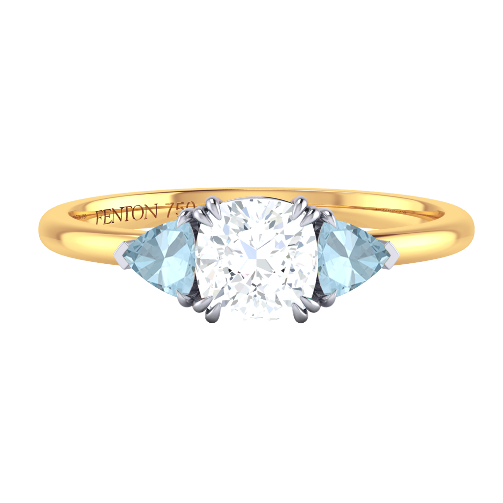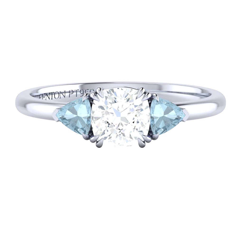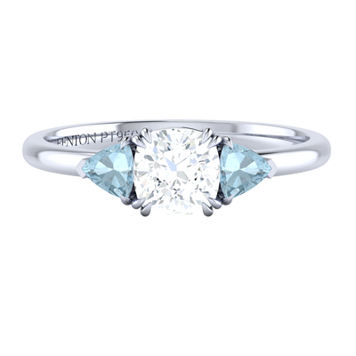 Lab Grown Solar Diamond Trilogy Cushion Cut Diamond and Aquamarine Platinum Ring