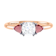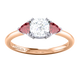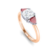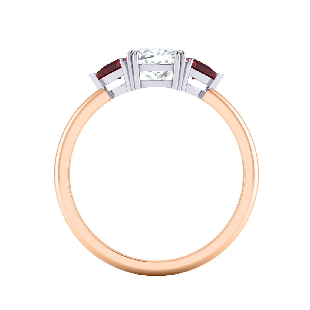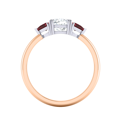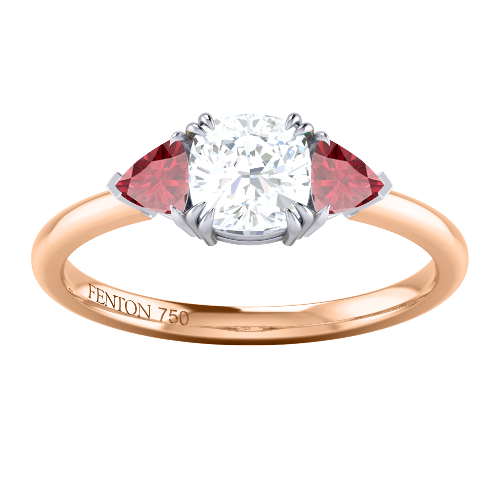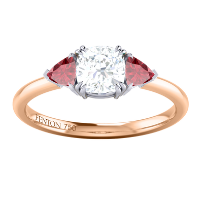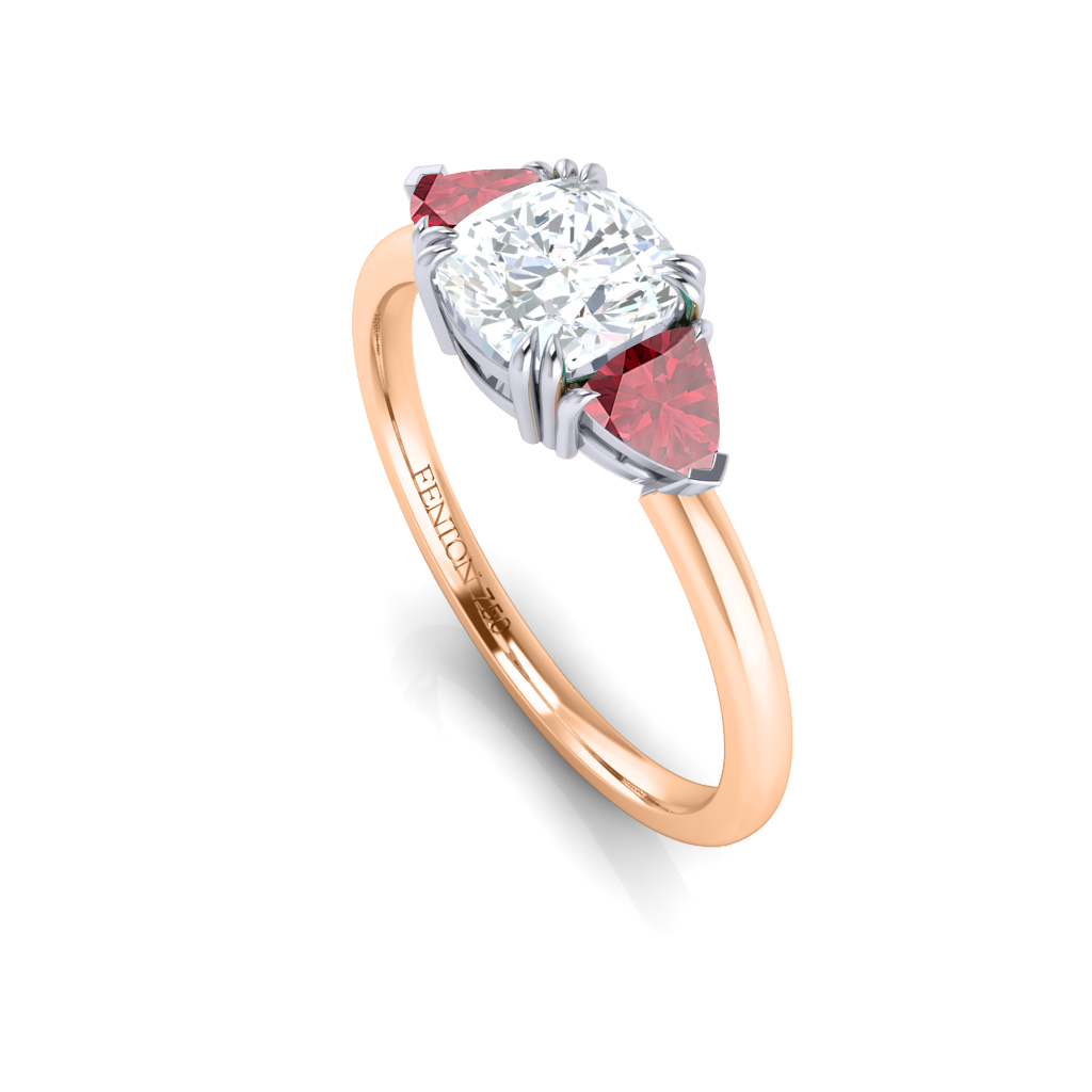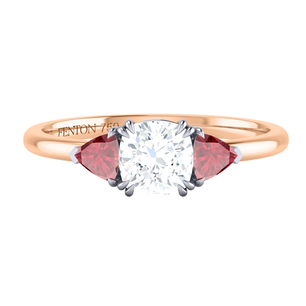 Lab Grown Solar Diamond Trilogy Cushion Cut Diamond and Ruby 18k Rose Gold Ring