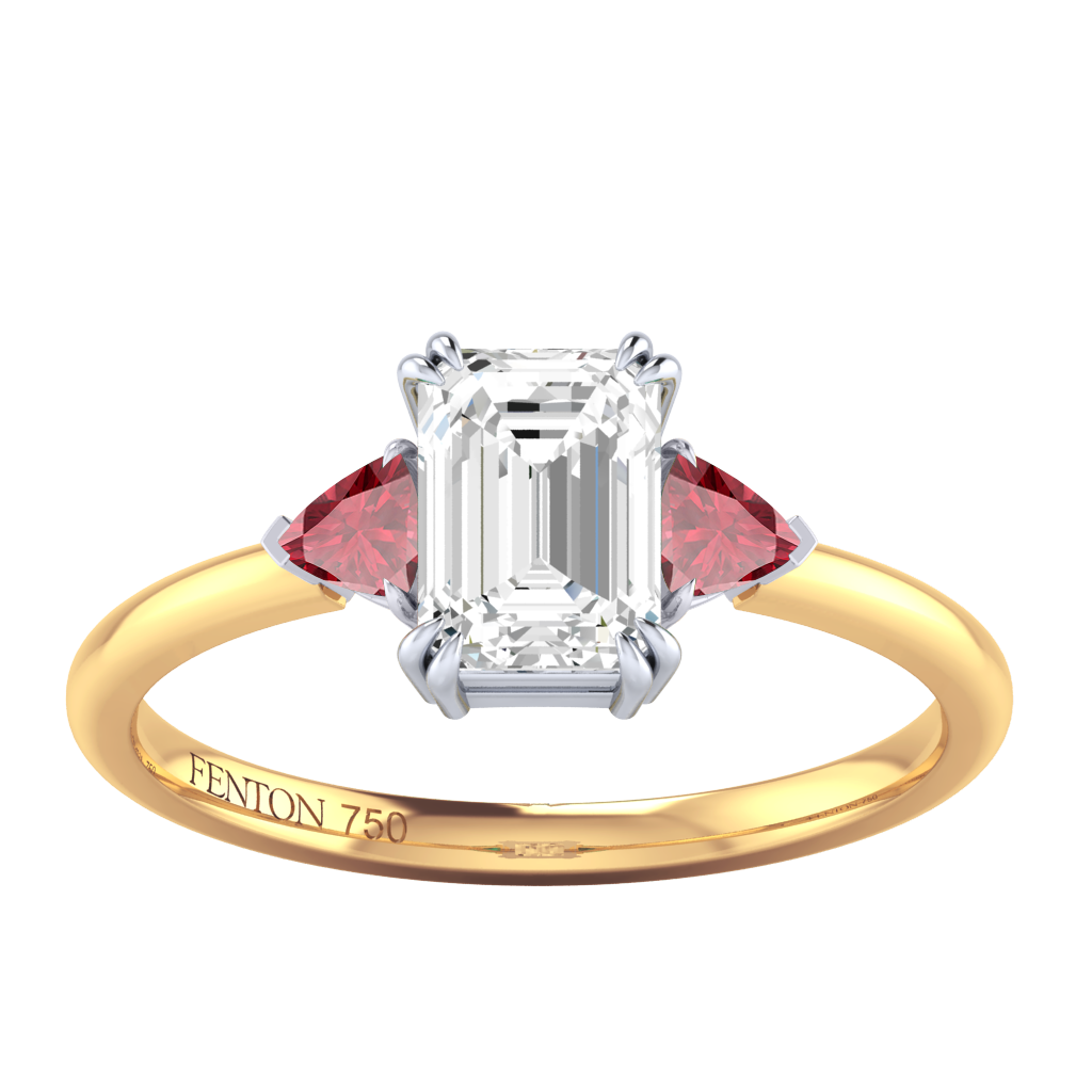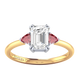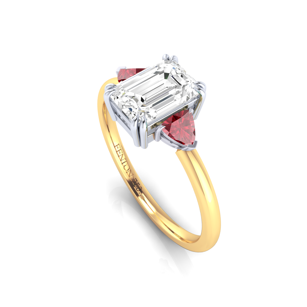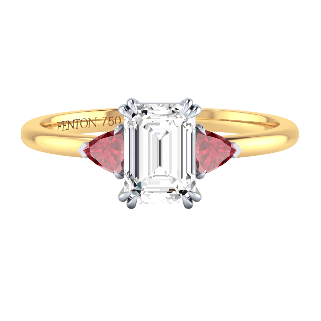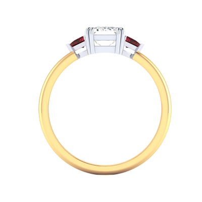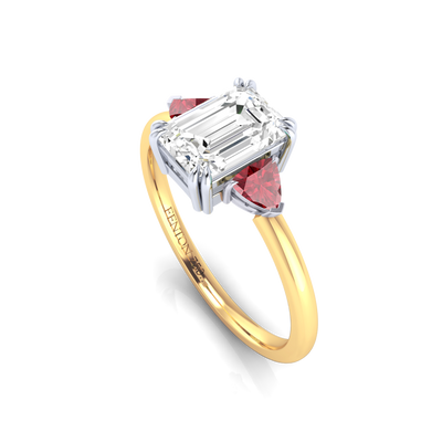 Lab Grown Solar Diamond Trilogy Emerald Cut Diamond and Ruby 18k Yellow Gold Ring