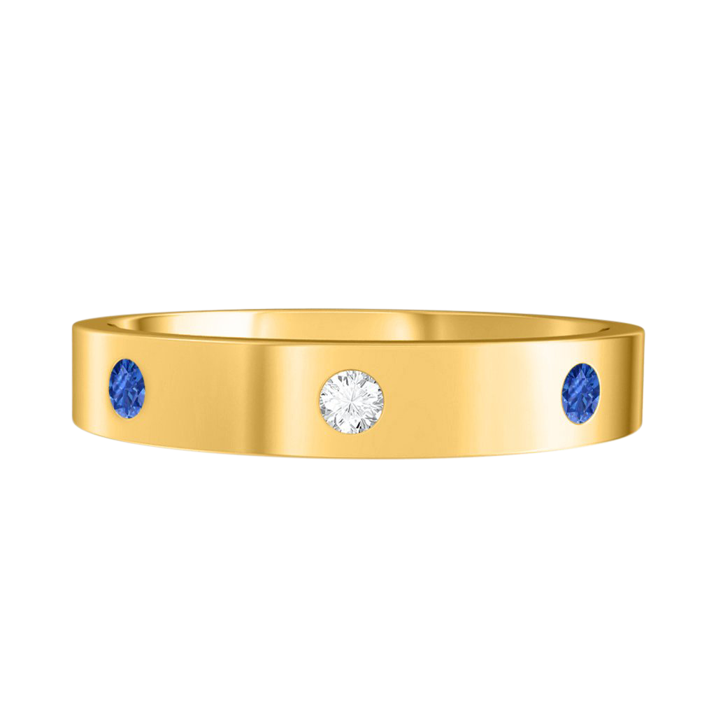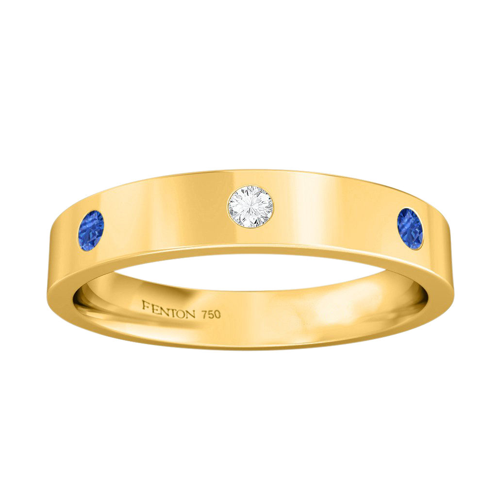 Mit unserem Drei-Steine-Band können Sie ein außergewöhnliches Schmuckstück kreieren, das garantiert alle Blicke auf sich zieht. Dieses Band ist 4 mm breit und aus 18 Karat Gelbgold gefertigt.